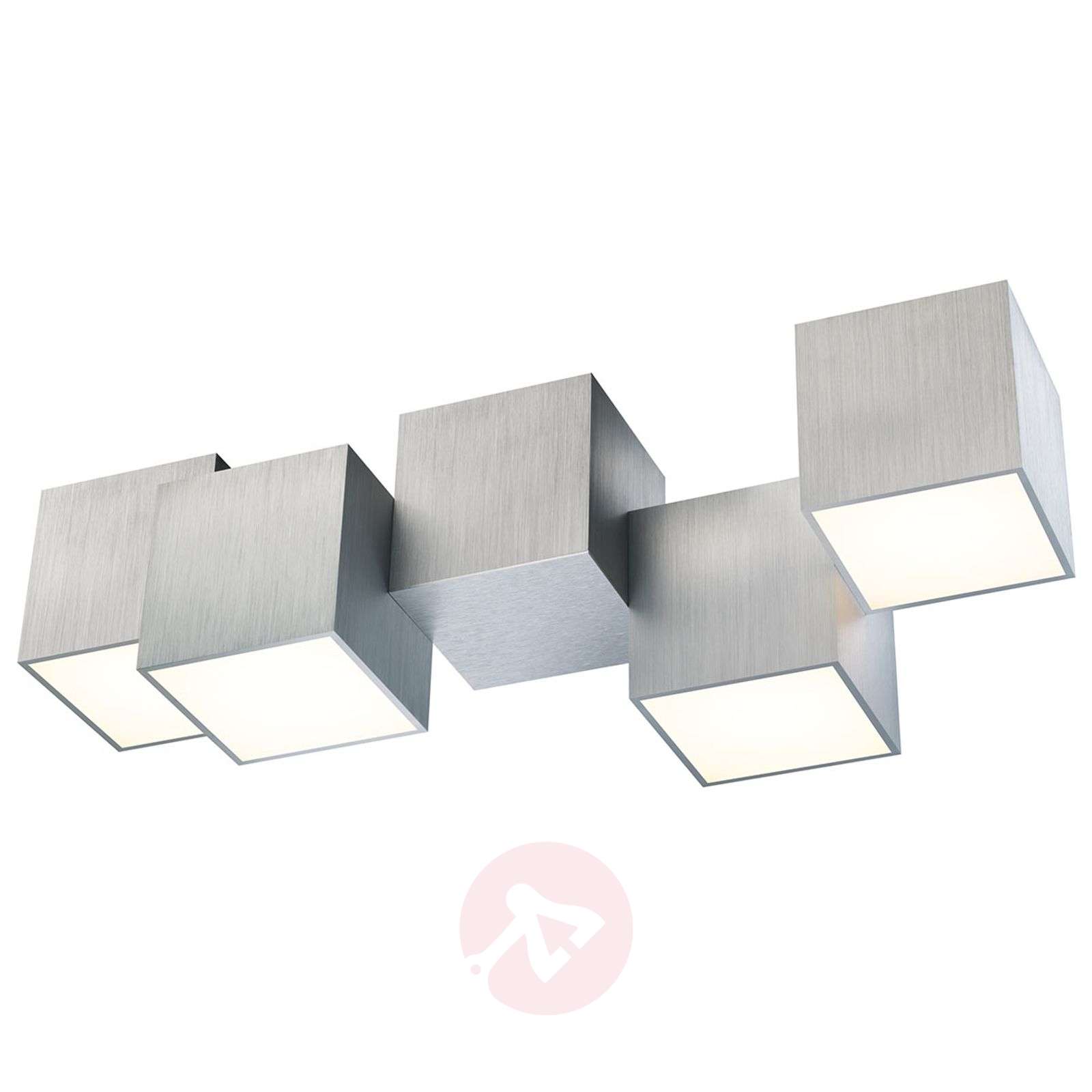 Pięć w jednym – lampa sufitowa LED Rocks Połączenie korpusów w kształcie sześcianu, wykonanych ze szczotkowanego aluminium, nadaje lampie sufitowej LED Rocks niezwykły wygląd, nie tylko wtedy, gdy światło jest załączone. Lampa sufitowa przyciąga wzrok i jest idealna do wnętrz urządzonych w stylu nowoczesnym. Jej monumentalny kształt przełamany został przez sześciany unoszące się w powietrzu oraz przez oświetlenie pośrednie sufitu. Podstawę lampy sufitowej stanowi sześcian znajdujący się w środku układu, który nie jest wyposażony w element oświetleniowy. Kostki świetlne są następnie mocowane do wewnętrznej kostki w różnych odległościach od sufitu. Dzięki możliwości ściemniania diod LED, cztery elementy oświetleniowe, z których każdy zajmuje spód sześcianu, zawsze zapewniają pożądaną jasność. Z racji obecności funkcji dim-to-warm barwa światła zmienia się w trakcie procesu ściemniania – wraz ze zmniejszającą się jasnością światło staje się cieplejsze. Warunkiem wstępnym ściemniania jest obecność ściemniacza z trybem nacinania fazy lub ściemniacza z trybem odcinania fazy. Klasa efektywności energetycznej: A+