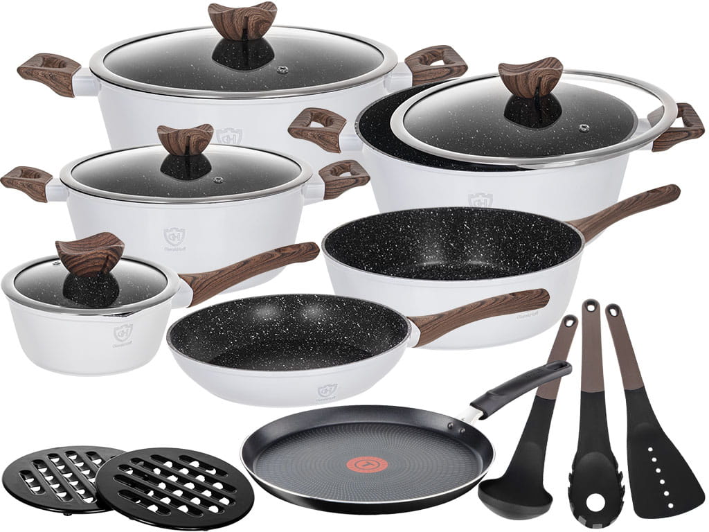 Zestaw garnków z powłoką marmurową z wielowarstwowymi dnami, które idealnie pasują do kuchenek indukcyjnych jak i zwykłych kuchenek. Białe garnki marmurowe posiadają pokrywki i uchwyty nienagrzewające się. Wygląd naczyń odmieni Twoją kuchnię. Siła tradycji GierekHoff GH 1502 + patelnia do naleśników Tefal Marmurkowe wnętrze garnków Indukcyjne dno każdego naczynia Nienagrzewające się uchwyty 3 garnki z pokrywką, o różnych pojemnościach Rondel z pokrywką idealny do gotowania sosów, budyniu czy podgrzewania mleka W zestawie 2 patelnie: tradycyjna i głęboka Patelnia teflonowa do naleśników Tefal Pokrywki wykonane z wysokiej jakości szkła hartowanego ze stalową obręczą, dzięki czemu są odporne na uszkodzenia i idealnie pasują do garnków 2 podstawki odporne na wysokie temperatury Komplet 3 przyborów kuchennych niezbędnych w każdej kuchni Właściwości: Wspaniały, 15-częściowy komplet garnków wysokiej jakości z twardą powłoką marmurową. Dno termiczne: wysokiej jakości wielowarstwowe, które świetnie zatrzymuje i rozprowadza ciepło. Dzięki temu żywność nagrzewa się szybko, a ciepło jest dobrze magazynowane. Garnki nadają się do wszelkich źródeł ogrzewania: kuchenki elektryczne i gazowe, palniki szklane ceramiczne, halogenowe i indukcyjne. Patelnia do naleśników nie działa na indukcji. Oferowany komplet garnków to gwarancja zdrowego przygotowania jedzenia. Gotowanie w niewielkiej ilości wody, smażenie z oszczędnym użyciem tłuszczu minimalizuje utratę witamin, minerałów i smaku! Uchwyty się nie nagrzewają. Modny i atrakcyjny design. Garnki łatwe w utrzymaniu czystości. Garnki można bezpiecznie używać w zmywarce. GWARANCJA 24 msc. Skład zestawu garnków, pojemności optymalne: Garnek z pokrywką (średnica 20 cm, wys. 9,5 cm, poj. 2.7 L), Garnek z pokrywką (średnica 24 cm, wys. 10 cm, poj. 4.2 L), Garnek z pokrywką (średnica 28 cm, wys. 11 cm, poj. 5.5 L), Rondel z pokrywką (średnica 16 cm, wys. 7 cm, poj 1.1 L), Patelnia (średnica 24 cm, wys. 5 cm), Patelnia (średnica 28 cm, wys. 8 cm). Patelnia Tefal do naleśników (średnica górna 25 cm, średnica dolna 22 cm, wysokość 2 cm) Podstawki odporne na wysoką temperaturę x 2 szt Sztućce x 3 szt.