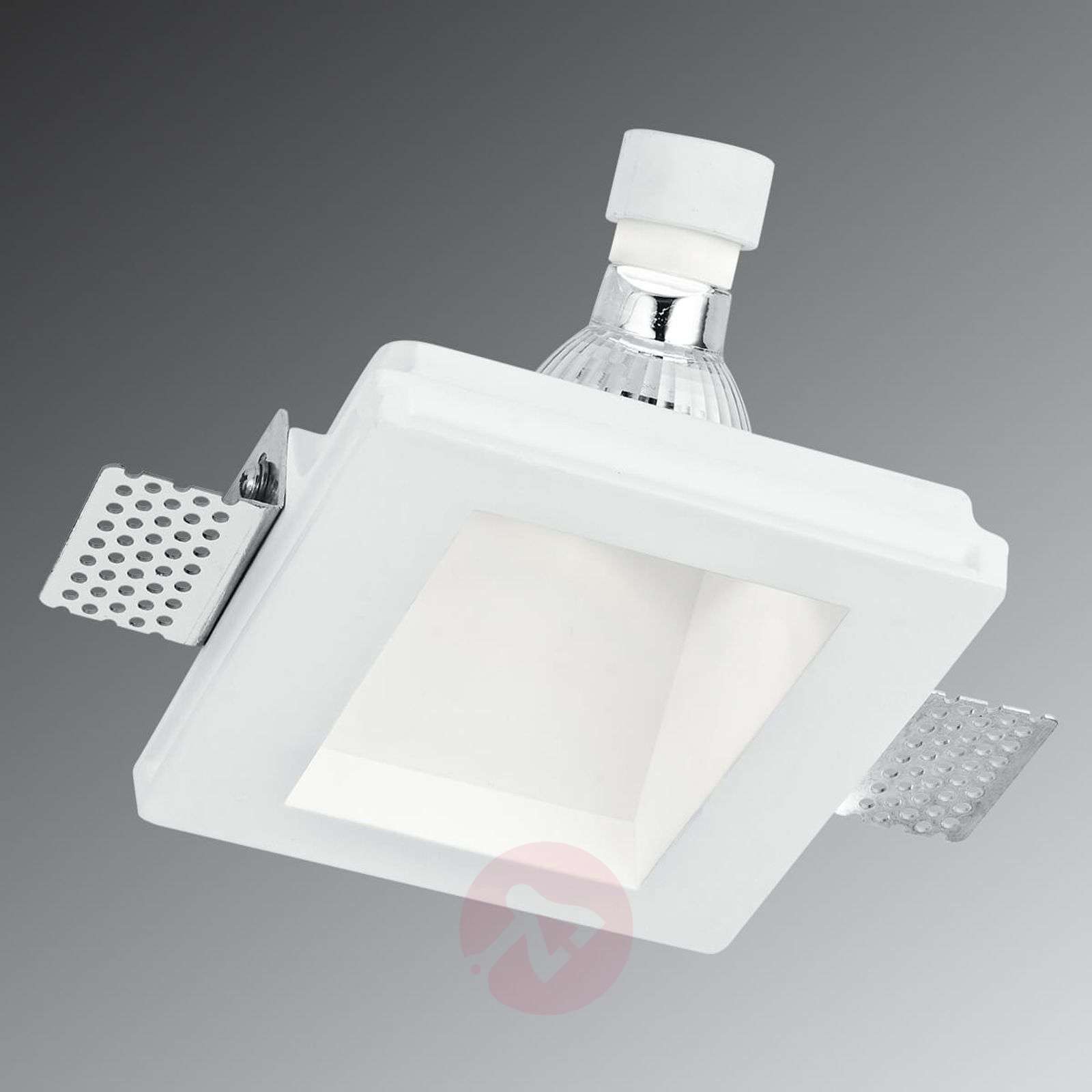 Wpuszczany spot Ghost z gipsu, do pomalowania Kwadratowy spot Ghost może być instalowany w jednej płaszczyźnie z powierzchnią sufitu, a dzięki zastosowanemu materiałowi daje się również dopasować kolorystycznie. Spot ma głębokość 6,5 cm i kątem wiązki 45°. Pasuje do niego lampa halogenowa GU10 o mocy do 35 W, podobnie jak żarówka LED z cokołem GU10. Klasa efektywności energetycznej: A++