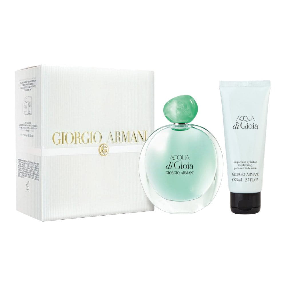 Kobieca Giorgio Armani Acqua di Gioia to zapach zaprezentowany w marcu 2010 roku, a jego autorami są Loc Dong, Anne Flipo i Dominique Ropion. Inspirowali się oni pięknem wyspy Antigui, jest to miejsce, gdzie swoje wakacje spędza sam Giorgio Armani. Zapach Acqua di Gioia ma ucieleśniać ucieczkę do natury, gdzie następuje powrót energii niezbędnej do prawidłowego funkcjonowania duszy i ciała. Ten konkretny zestaw składa się z dwóch kosmetyków, z wody perfumowanej (100 ml) oraz balsamu do ciała (75 ml). Z pewnością spodobają się one paniom gustującym w delikatnych i wyjątkowo kobiecych zapachach. Nutami głowy, otwierającymi przed nami świat Acqua di Gioia są: cytryna Amalafi oraz nadająca całości powiew świeżości mięta. W sercu perfum dominuje jaśmin wraz z piwonią i różowym pieprzem. Bazę stanowią natomiast: brązowy cukier, cedr virginia oraz francuskie labdanum. Woda toaletowa dla kobiet Giorgio Armani Acqua di Gioia ma być ożywcza jak kropla wody, dodawać energii oraz przynosić spokój i relaksować duszę.