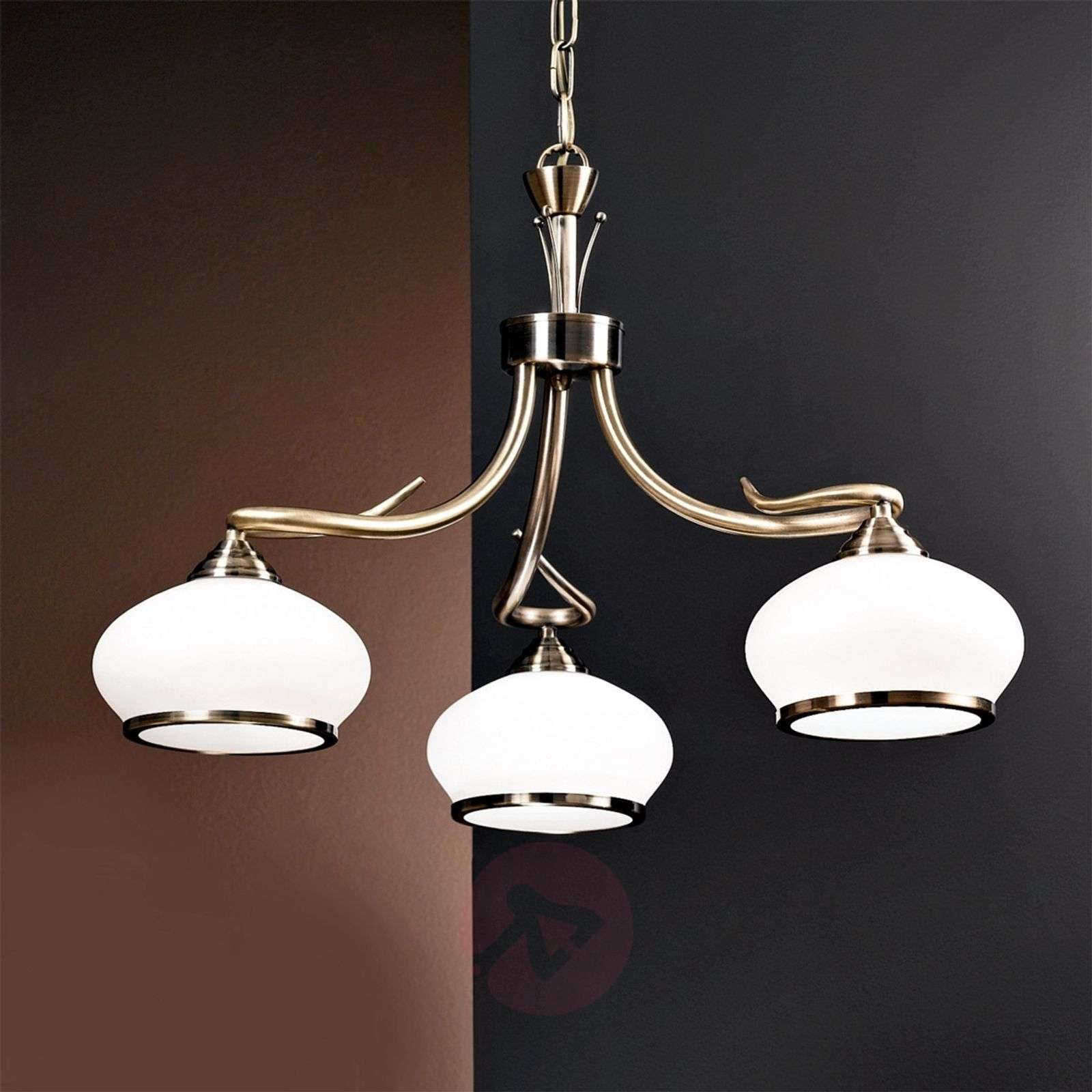Pięciopunktowa lampa wisząca Elvira ze szkieletem w kolorze starzonego mosiądzu Lampa wisząca Elvira jest propozycją łączącą elementy klasyczne i nowoczesne i składa się z półmatowych kloszy szklanych z metalowym obrzeżem oraz kunsztownie wykończonego szkieletu, którego ramiona są skręcone do wewnątrz. Lampa wisząca, która jak ulał pasuje do oświetlenia stołu jadalnego - centrum życia towarzyskiego i spotkań w miłym towarzystwie. Klasa efektywności energetycznej: A++