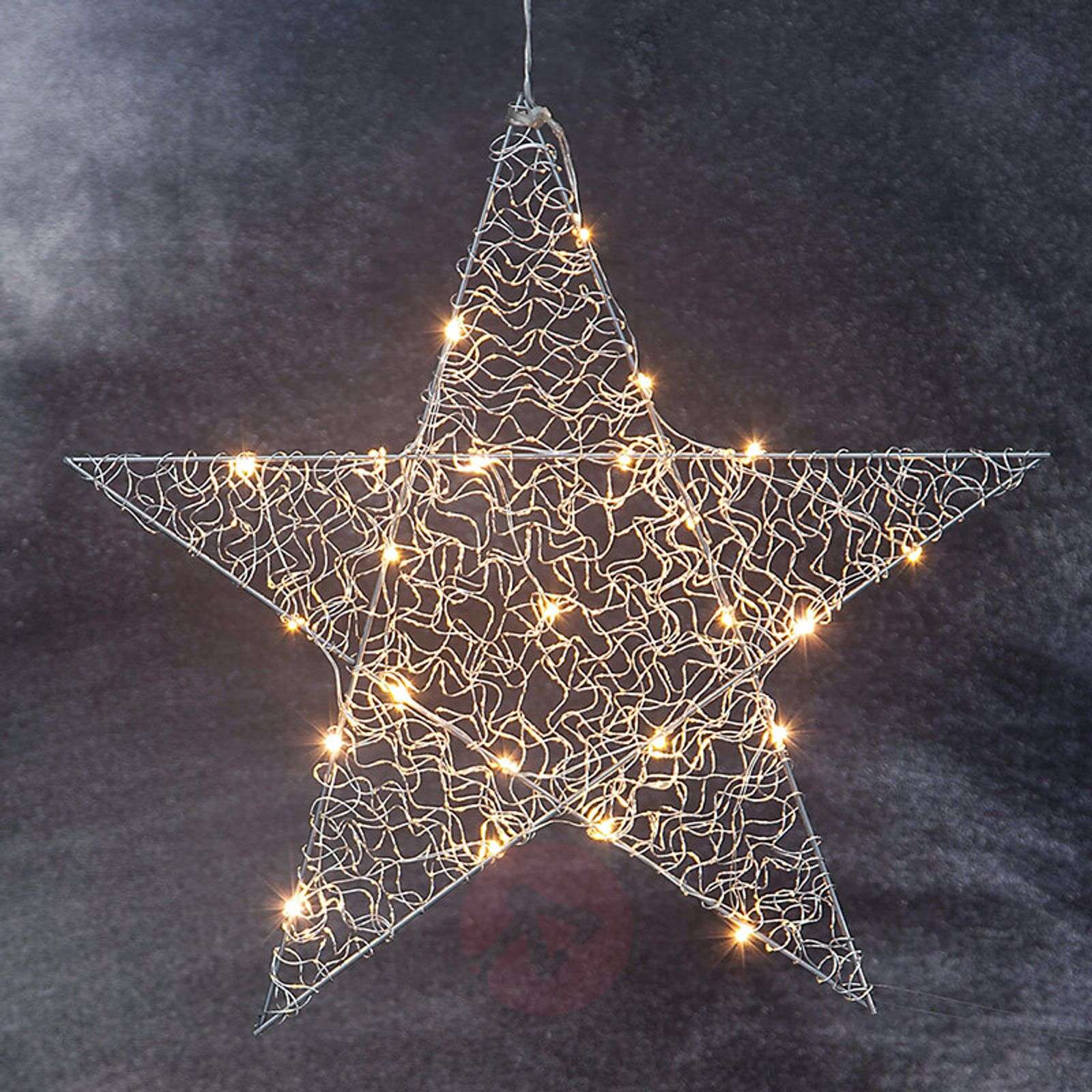 Gwiazda LED Loop do zawieszenia, chromowana na wysoki połysk Wnętrze kształtu gwiazdy LED Loop wykonane jest z metalowej plecionki, która jeszcze bardziej podkreśla delikatność pięcioramiennego konturu. Światło zapewniają 24 diody LED, których ciepła biel tworzy nastrojowy klimat. Szczególnie dekoracyjnie gwiazda ta wygląda w oknie, ale równie dobrze można ją po prostu powiesić w pomieszczeniu. W dostawie zawarto transformator.