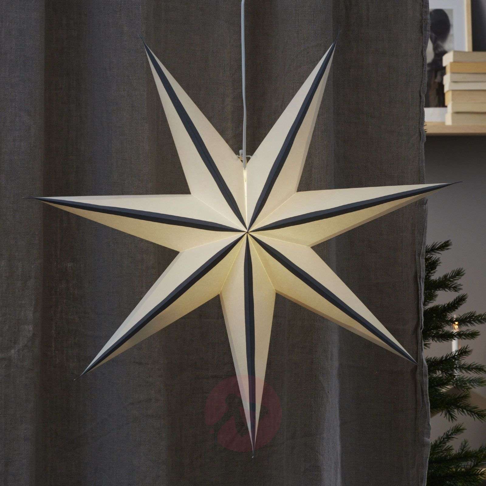 Gwiazda dekoracyjna Randi w kolorze białym - z kolorowymi paskami Siedmioramienna gwiazda dekoracyjna Randi może być używana we wszystkich pomieszczeniach jako dekoracja. Gwiazda wykonana z białego papieru z kolorowymi paskami może być ustawiona lub - po wyposażeniu w białą wstążkę - zawieszona. Randi nie jest wyposażona w oświetlenie. Kabel sieciowy z oprawą E14 można zamówić oddzielnie za pośrednictwem akcesoriów.