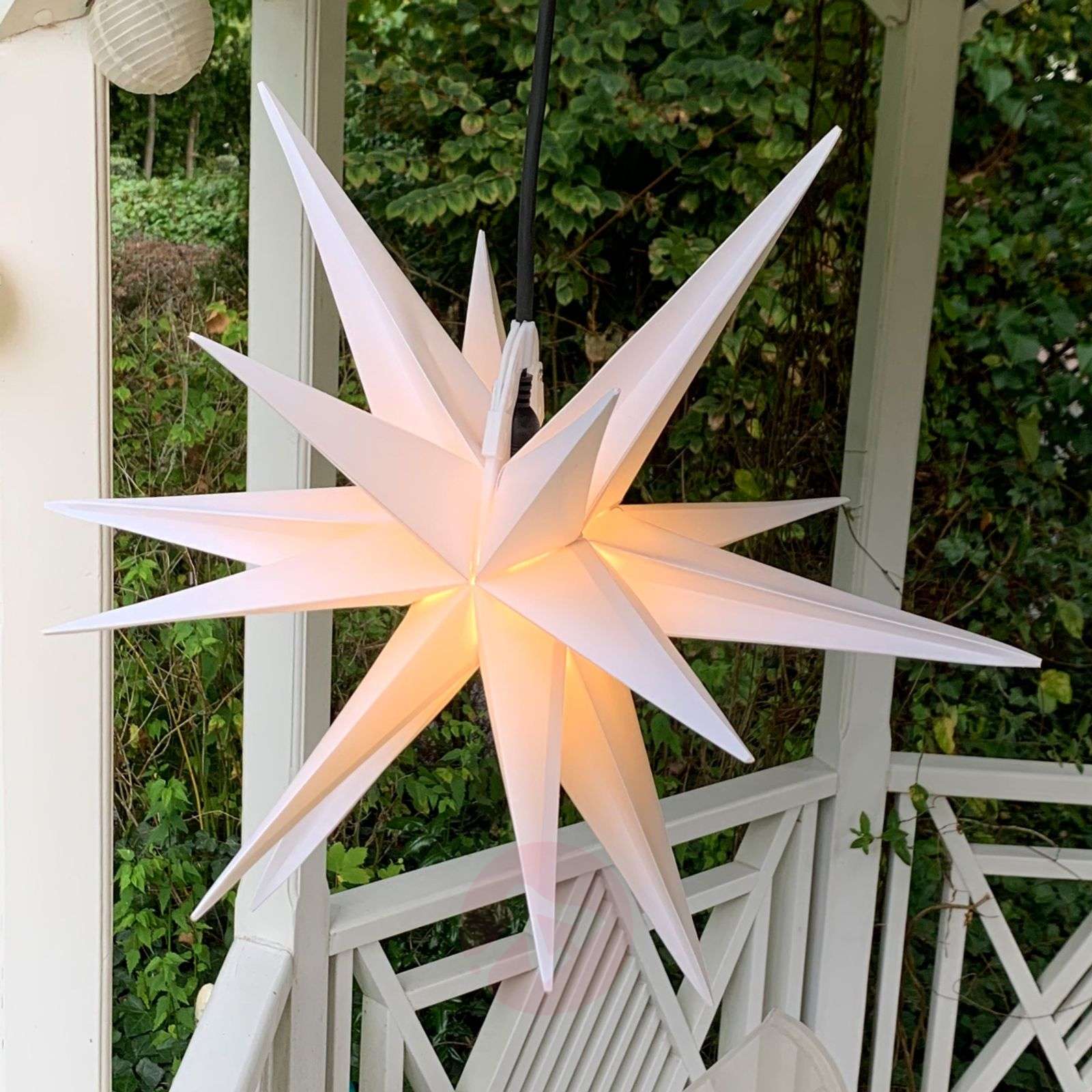 Do zimowo-świątecznych dekoracji na zewnątrz: gwiazda dekoracyjna z 18 ramionami, Ø 40 cm Ta bardzo wytrzymała gwiazda z tworzywa sztucznego sprawia, że ozdoba świąteczna wokół domu jest naprawdę kompletna. Dzięki wytrzymałemu materiałowi i wyposażeniu z klasą ochrony IP44, ten fascynujący element dekoracyjny sprawdzi się przez długi czas. Jej niezwykły wygląd sprawia, że gwiazda, zawieszona na przykład za oknem, jest bardzo dekoracyjna i przyciąga wzrok nie tylko w okresie Bożego Narodzenia. - w komplecie kabel zasilający z wtyczką (długość 400 cm) Klasa efektywności energetycznej: A++