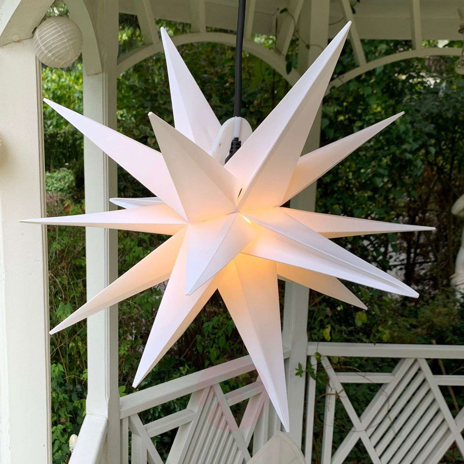 18-ramienna gwiazda dekoracyjna w formacie XXL - wspaniały dodatek dekoracyjny do zastosowań zewnętrznych Dzięki średnicy 80 cm gwiazdy dekoracyjnej XXL nie da się nie zauważyć. Nie tylko przyciąga uwagę swoim rozmiarem, ale również fantastycznym 18-ramiennym wyglądem. Gwiazda jest wykonana z wytrzymałego tworzywa sztucznego i dzięki stopniowi ochrony IP44 jest optymalnie zabezpieczona przed niekorzystnymi warunkami atmosferycznymi. Czy to jako dekoracja okienna z zewnątrz, czy też zawieszona na występie dachowym, ta piękna gwiazda dekoracyjna przyciąga wzrok wszędzie i zapewnia odpowiedni nastrój świąteczny. Zakres dostawy obejmuje kabel zasilający o długości 4 m. Klasa efektywności energetycznej: A++