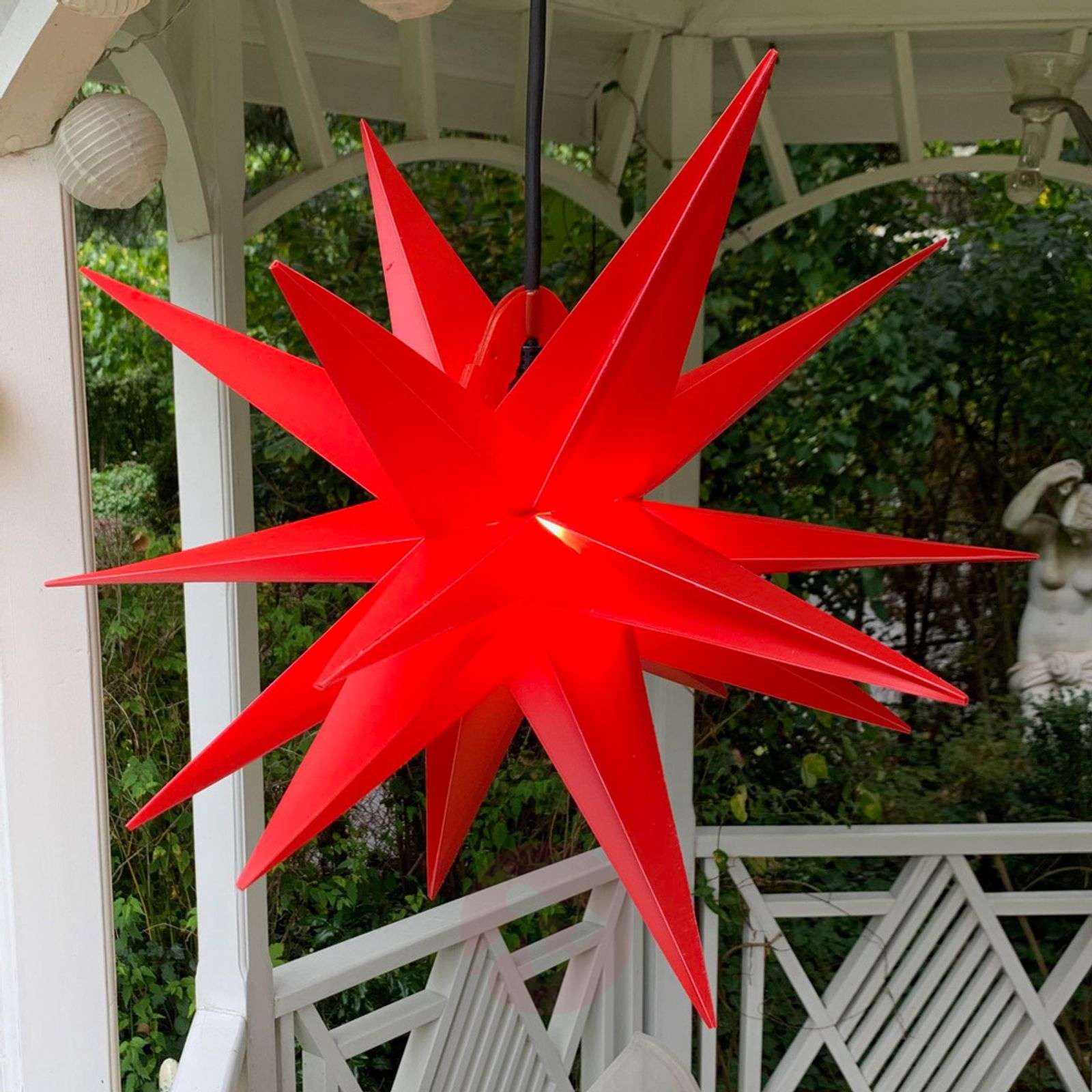18-ramienna gwiazda dekoracyjna w formacie XXL - wspaniały dodatek dekoracyjny do zastosowań zewnętrznych Dzięki średnicy 80 cm gwiazdy dekoracyjnej XXL nie da się nie zauważyć. Nie tylko przyciąga uwagę swoim rozmiarem, ale również fantastycznym 18-ramiennym wyglądem. Gwiazda jest wykonana z wytrzymałego tworzywa sztucznego i dzięki stopniowi ochrony IP44 jest optymalnie zabezpieczona przed niekorzystnymi warunkami atmosferycznymi. Czy to jako dekoracja okienna z zewnątrz, czy też zawieszona na występie dachowym, ta piękna gwiazda dekoracyjna przyciąga wzrok wszędzie i zapewnia odpowiedni nastrój świąteczny. Zakres dostawy obejmuje kabel zasilający o długości 4 m. Klasa efektywności energetycznej: A++