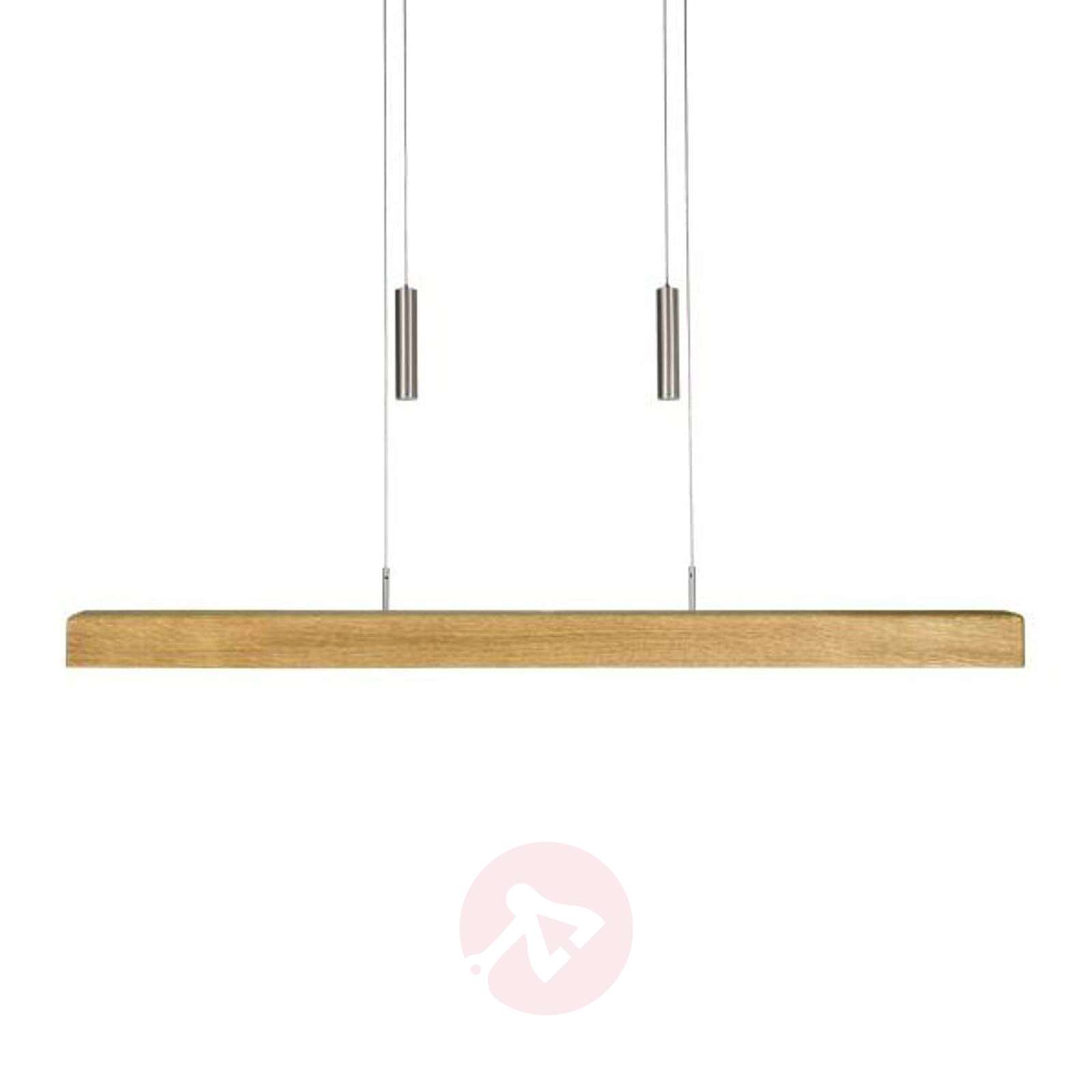 Elegancka lampa wisząca LED Leonora z regulacją wysokości Lampa wisząca LED Leonora firmy HerzBlut z regulacją wysokości może być zawieszona wyżej lub niżej, gdyż ma zamontowany wielokrążek. Długość linek stalowych można określić podczas montażu, skracając je w prosty sposób. Dzięki temu możliwe jest indywidualne dostosowanie światła do warunków panujących w pomieszczeniu. Smukły element drewniany, na którym zamontowano elementy oświetleniowe LED oraz cylindryczne przeciwwagi do mechanizmu linkowego sprawiają, że oprawa wygląda na bardzo stechnicyzowaną. Mazerunek drewna, szczególnie widoczny po zastosowaniu procedury olejowania, sprawia, że ta stechnicyzowana lampa wygląda na bardziej subtelną i staje się elementem dekoracyjnym pełnym przytulności. Klasa efektywności energetycznej: A+