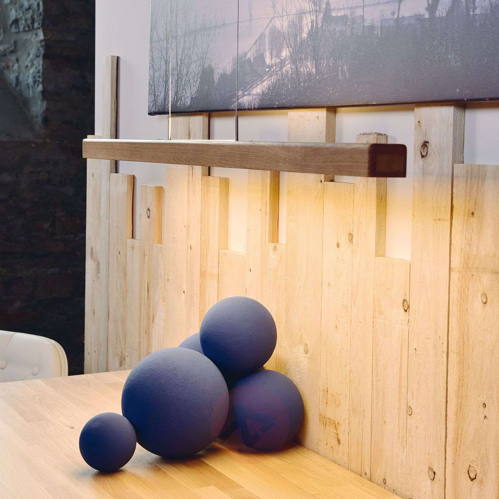 Lampa wisząca belka Leonora z regulowaną wysokością i efektem świetlnym Lampa wisząca LED Leonora firmy HerzBlut emanuje eleganckim, ale naturalnym blaskiem i dzięki różnym praktycznym możliwościom regulacji jest elastyczną lampą dla nowoczesnych wnętrz. Obie linki zawieszenia są prowadzone przez metalową rozetę sufitową i wyposażone regulację wysokości na drugim końcu, co pozwala na szybką i łatwą zmianę wysokości zawieszenia. Długa drewniana wiązka wyposażona jest w diody LED na górze i na dole, dzięki czemu uzyskuje się oświetlenie pośrednie i bezpośrednie. Ale Leonora ma jeszcze jedną sztuczkę w zanadrzu. Na belce wbudowany jest ściemniacz dotykowy, dzięki któremu można wybrać jasne światło o barwie uniwersalnej bieli do ściemnionego światła o barwie bardzo ciepłej bieli. Dzięki temu lampa wisząca belka zapewnia doskonałe światło w różnych sytuacjach - od pracy w domu przy stole w salonie po przytulną kolację przy stole w jadalni. - zawieszenie o regulowanej wysokości, które może zostać skrócone podczas montażu Klasa efektywności energetycznej: A+