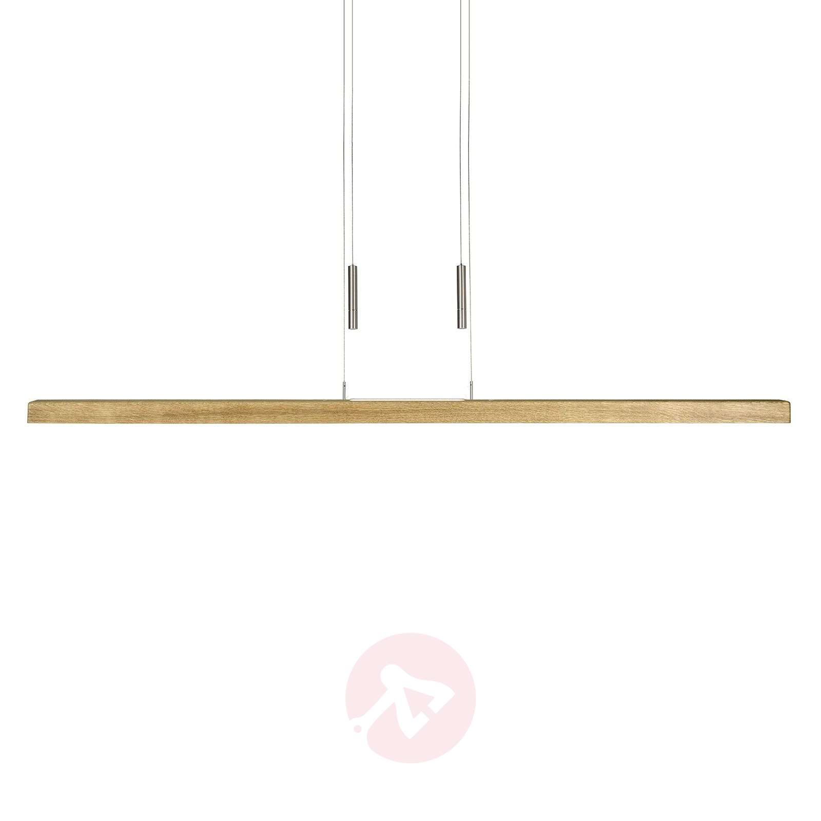 Lampa wisząca belka Leonora z regulowaną wysokością i efektem świetlnym Lampa wisząca LED Leonora firmy HerzBlut emanuje eleganckim, ale naturalnym blaskiem i dzięki różnym praktycznym możliwościom regulacji jest elastyczną lampą dla nowoczesnych wnętrz. Obie linki zawieszenia są prowadzone przez metalową rozetę sufitową i wyposażone regulację wysokości na drugim końcu, co pozwala na szybką i łatwą zmianę wysokości zawieszenia. Długa drewniana wiązka wyposażona jest w diody LED na górze i na dole, dzięki czemu uzyskuje się oświetlenie pośrednie i bezpośrednie. Ale Leonora ma jeszcze jedną sztuczkę w zanadrzu. Na belce wbudowany jest ściemniacz dotykowy, dzięki któremu można wybrać jasne światło o barwie uniwersalnej bieli do ściemnionego światła o barwie bardzo ciepłej bieli. Dzięki temu lampa wisząca belka zapewnia doskonałe światło w różnych sytuacjach - od pracy w domu przy stole w salonie po przytulną kolację przy stole w jadalni. - zawieszenie o regulowanej wysokości, które może zostać skrócone podczas montażu Klasa efektywności energetycznej: A+