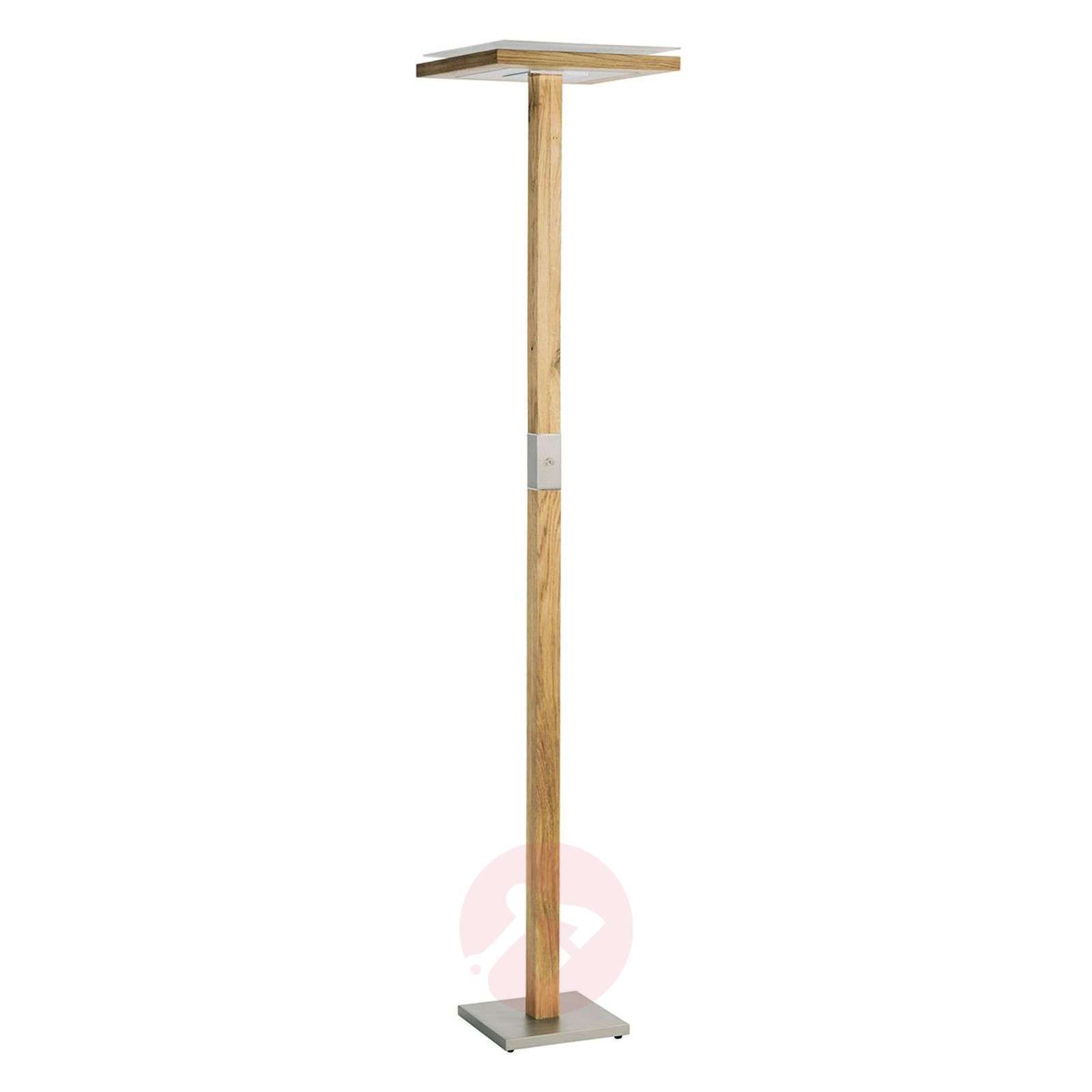 Lampa stojąca LED Otto O z litego drewna ze ściemniaczem dotykowym Stojak z litego drewna z płaskim, kwadratowym kloszem: to właśnie sprawia, że lampa stojąca LED Otto O jest wyjątkową lampą oświetlającą sufit. Kwadratowy przekrój poprzeczny zaczyna się od podstawy lampy, która składa się z kwadratowej płyty metalowej i jest kontynuowany poprzez stojak do klosza lampy. Długa, prostopadłościenna podstawa jest przerwana w połowie wysokości metalową aplikacją, w której znajduje się ściemniacz dotykowy do funkcji „dimm to warm” oraz do włączania i wyłączania. Umożliwia on ustawienie dowolnej możliwej barwy światła, od uniwersalnej bieli do światła świec. Ogólnie rzecz biorąc, ta lampa podłogowa ma bardzo liniową konstrukcję i wprowadza do pomieszczenia nie tylko światło, ale i przyjemną atmosferę. Klasa efektywności energetycznej: A+