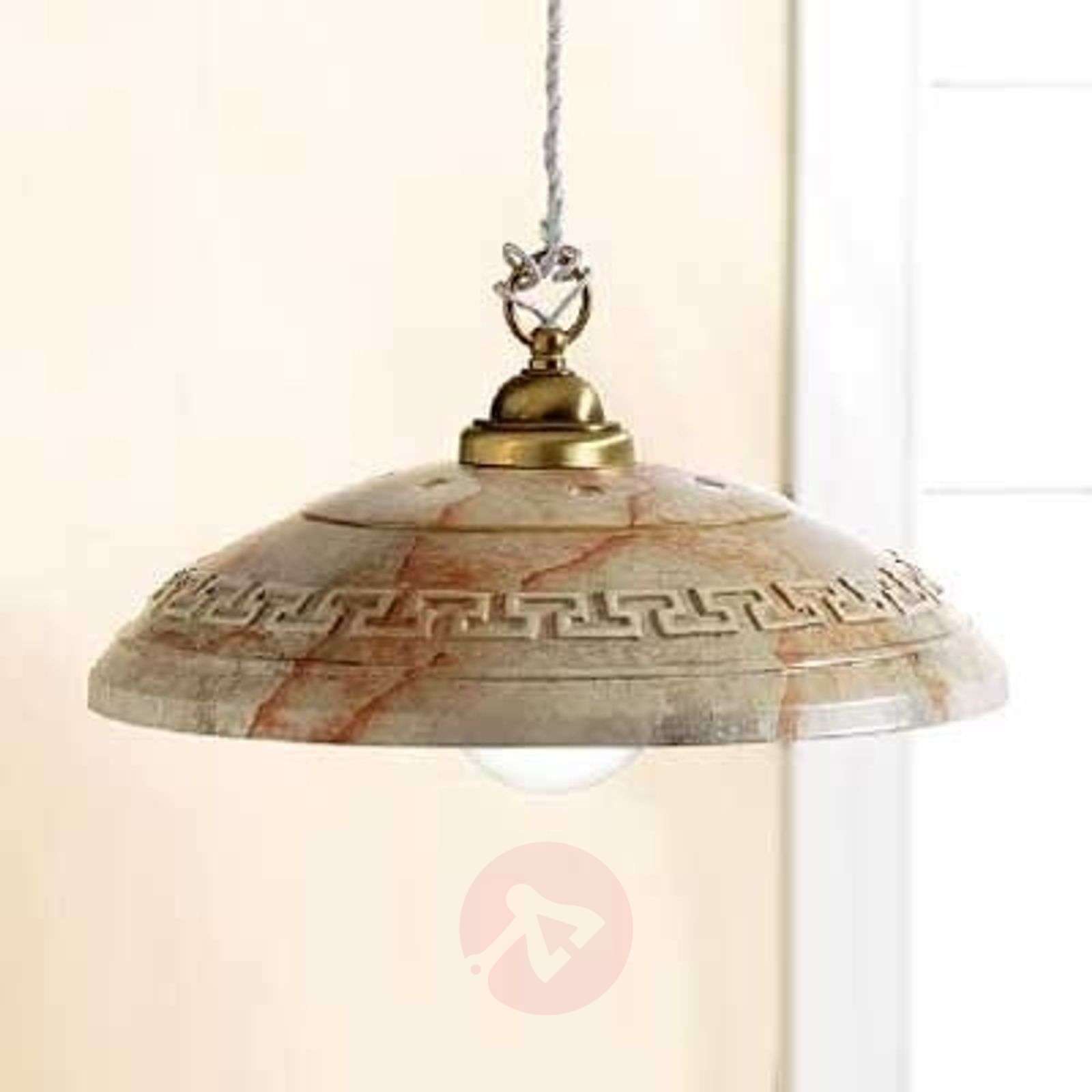 Powiew magii krajów południa - lampa wisząca GRECA MARMO Lampa wisząca GRECA MARMO zachwyca kloszem w stylistyce greckiego marmuru i uwodzi śródziemnomorską aurą. Strumień światła dociera bezpośrednio w dół i roztacza jasny, łagodny blask ponad stołem kuchennym lub w jadalni. Klasa efektywności energetycznej: A++