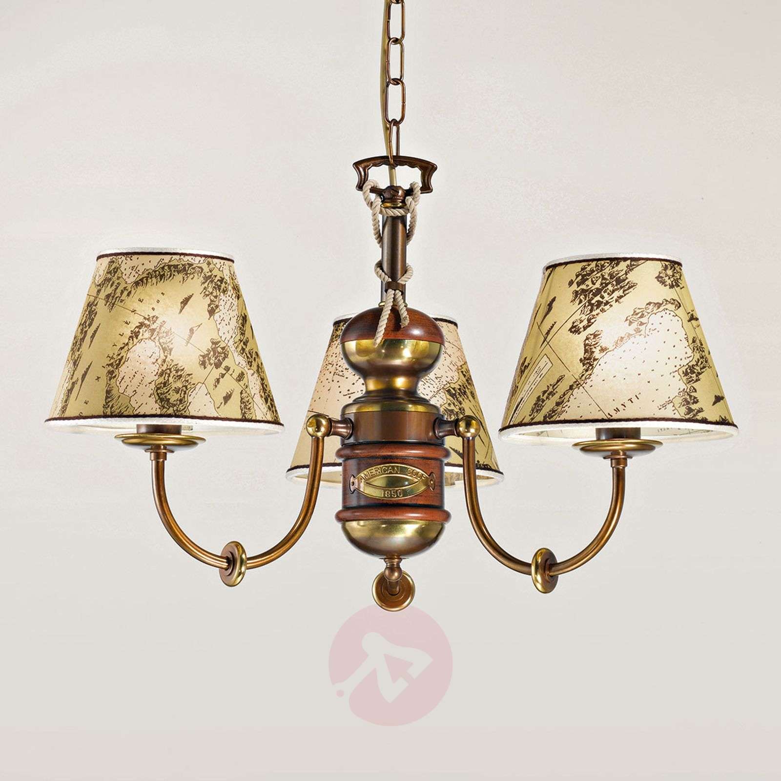 Żyrandol Nautica podkreśla styl klasyczno-marynarski Żyrandol Nautica jest doskonałym dodatkiem, jeżeli zależy nam na podkreśleniu morskiego stylu życia i wyposażenia - bez wątpienia ściągnie na siebie wzrok niejednego gościa. Trzy wygięte ramiona wykonane z wybłyszczonego w niektórych miejscach, zaś na całej powierzchni stonowanego, brązowanego mosiądzu odchodzą od mosiężnego szkieletu udekorowanego linami, godłem i drewnem. Morskiego charakteru lampy dopełniają trzy tekstylne abażury, na których nadrukowane są mapy mórz, przepuszczające miękkie światło i wzbudzające tęsknotę za wyprawą w nieznane. Klasa efektywności energetycznej: A++