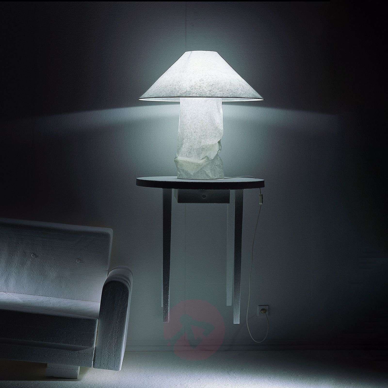 Ręcznie wykonana designerska lampa stołowa z japońskiego papieru Ingo Maurer sięgnął po klasyczny kształt lampy tworząc lampę stołową Lampampe, interpretując ją w nowoczesny sposób. Lampa nie składa się tradycyjnie z klosza z tkaniny i stabilnej podstawy, ale została wykonana w całości z japońskiego papieru naciągniętego na metalową ramę. Papier jest celowo lekko zgnieciony i tym samym tworzy ciekawe elementy cieni. Zastosowany materiał jest bardzo cienki i półprzezroczysty, tworząc pośrednie, rozproszone światło wokół lampy. Ze względu na delikatny papier, w żadnym wypadku nie wolno umieszczać lampy w pomieszczeniach o dużej wilgotności. Klasa efektywności energetycznej: A++
