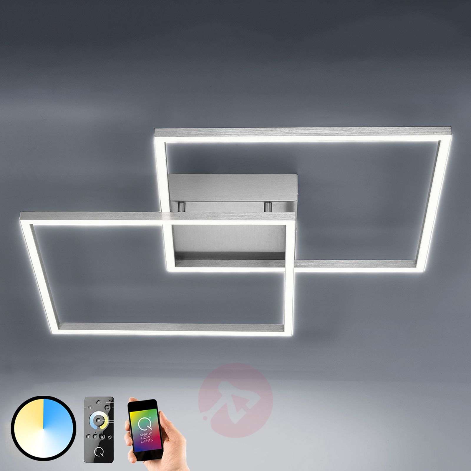 Filigranowa lampa sufitowa LED Inigo z pilotem Decydując się na tę filigranową lampę sufitową LED Inigo, nie musimy wybierać specjalnej barwy światła, ponieważ światło białych diod LED może być bezstopniowo regulowane w zakresie od 2 700 kelwinów do 5 000 kelwinów. Wyboru temperatury barwowej dokonujemy za pomocą pokrętła wyboru na pilocie radiowym, wchodzącym w skład zestawu. Oznacza to, że ta lampa sufitowa może być używana w każdym miejscu i wykorzystywana podczas każdej czynności i zapewnić może każdego typu światło, od jasnego oświetlenia do pracy po przytulne oświetlenie wieczorem, podczas oglądania telewizji. Ponadto, niezależnie od wprowadzonych ustawień, możemy płynnie ściemniać jasność. Ta stalowa lampa sufitowa składa się z dwóch filigranowych, kwadratowych ram, które są montowane na zakładkę na uchwycie sufitowym, który również ma kształt kwadratu. Zainstalowane w kwadratach diody LED osłonięte są satynowanymi akrylowymi dyfuzorami, przez które światło świeci bardzo równomiernie. Ta lampa sufitowa LED jest wyposażona w technologię ZigBee, dzięki czemu można ją zintegrować z systemem ZigBee smart home i sterować z dowolnego miejsca - za pomocą smartfona lub tabletu, korzystając z odpowiedniego oprogramowania. Klasa efektywności energetycznej: A+