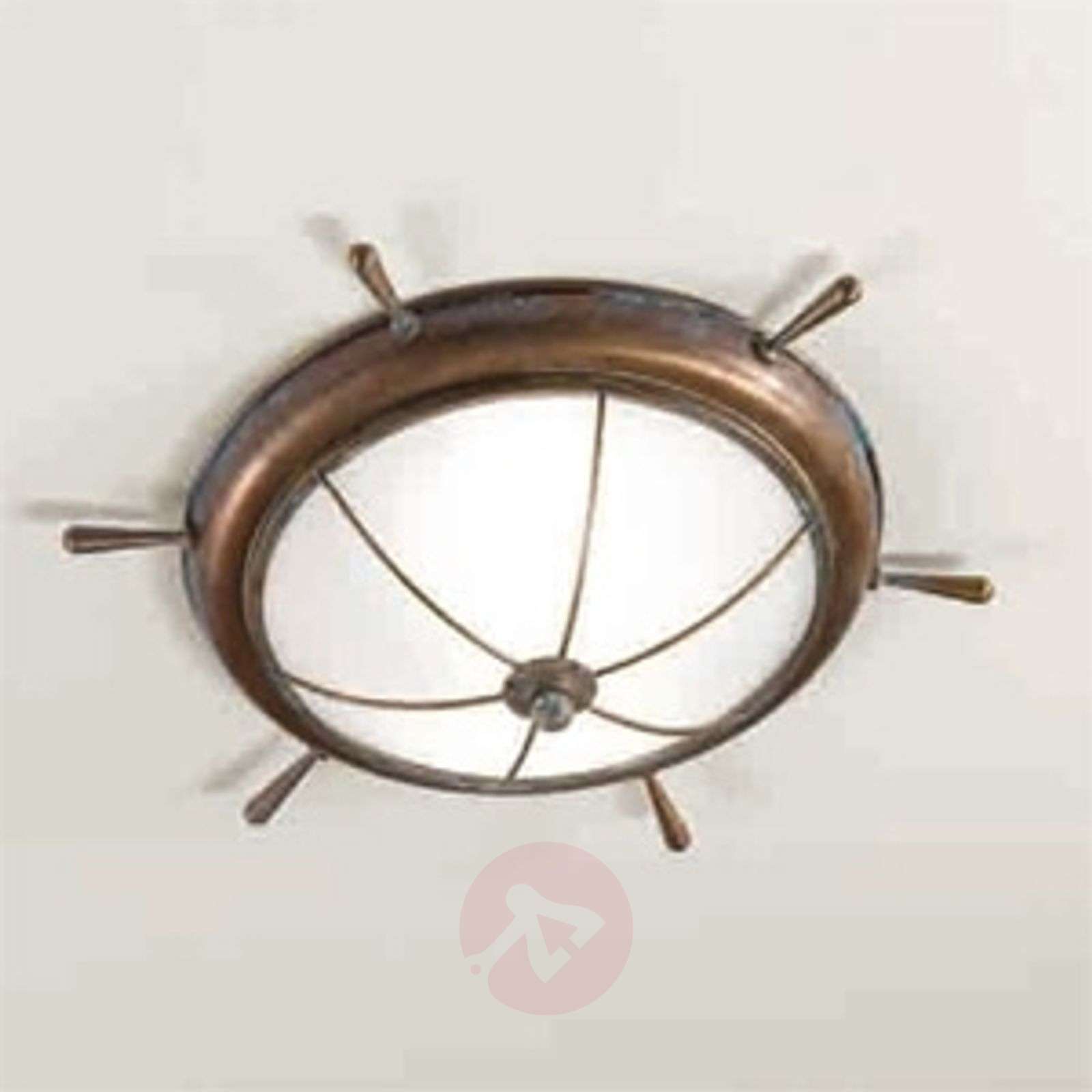 Lampa sufitowa Libeccio w stylu marynarskim W lampie Libeccio na pierwszy rzut oka rozpoznamy nawiązania do żeglugi morskiej: jej konstrukcja stylizowana jest na koło sterowe okrętu. Ta piękna lampa sufitowa z dużym, białym kloszem emituje jasne światło, zapewniając przepiękne oświetlenie ogólne. Klosz wyglądem przypomina iluminator, utrzymywany na metalowej kratce o kolorze analogicznym do koloru konstrukcji. Klasa efektywności energetycznej: A++