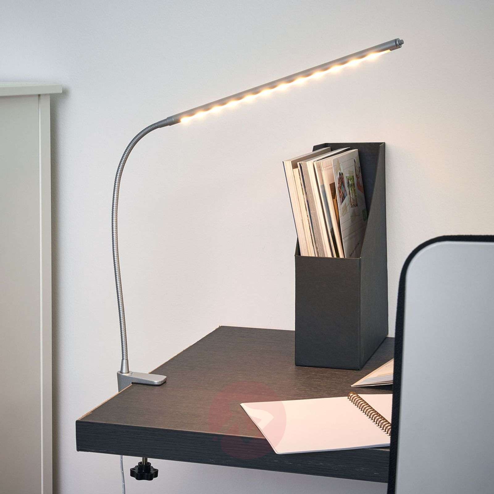 Lampa stołowa LED ANKA z praktyczną klamrą zaciskową i giętkim, wysięgającym ramieniem Lampa stołowa LED ANKA najlepiej sprawdzi się w miejscu pracy o ograniczonej wolnej powierzchni, gdzie potrzebne jest jasne, efektowne oświetlenie. Klamra zaciskowa pozwala za pomocą kilku ruchów ręką umieścić ją na biurku lub zdjąć, jeśli nie jest w danym momencie potrzebna. Giętkie ramię umożliwia idealne ustawienie światła tam, gdzie jest ono potrzebne. Lampa stołowa jest wyposażona w 24 diody LED o barwie uniwersalnej bieli (240 lm), które odznaczają się niezwykle niskim zużyciem energii. Klasa efektywności energetycznej: A