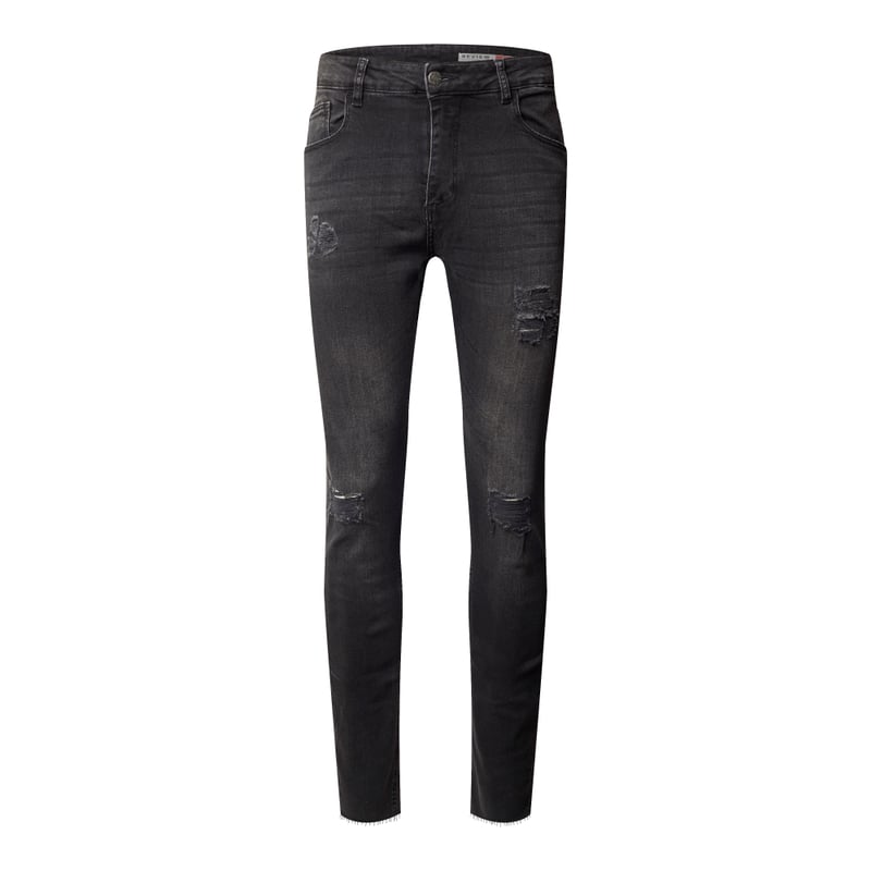 Jeansy męskie REVIEW, Mieszanka bawełny i elastanu , Krój skinny fit , Zapięcie na guzik i zamek błyskawiczny , 5 kieszeni , Efekt znoszenia , Długość wewnętrzna nogawki w rozmiarze 32/32: 79 cm, Szerokość w pasie w rozmiarze 32/32: 80 cm