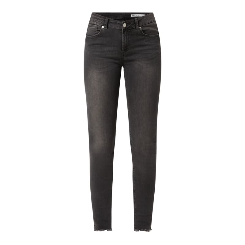 Jeansy damskie REVIEW, Mieszanka bawełny z dodatkiem streczu, Krój skinny fit, Zapięcie na guzik i zamek błyskawiczny, 5 kieszeni, Postrzępione brzegi nogawek, Naszywka z logo w pasie, Długość wewnętrzna nogawki w rozmiarze 27/LO: 75 cm, Szerokość w pasie w rozmiarze 27/LO: 72 cm