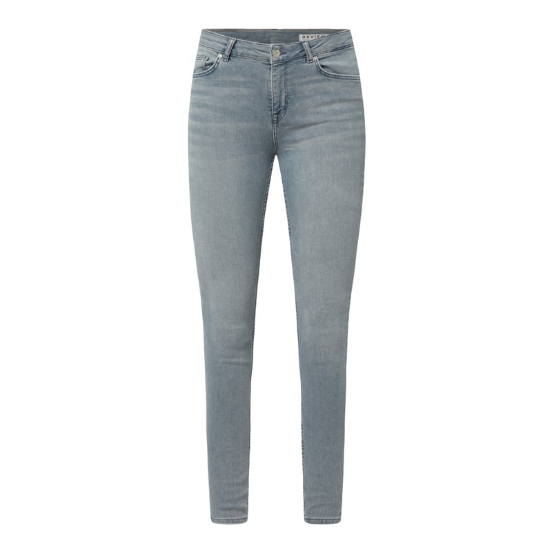 Jeansy damskie REVIEW , Mieszanka bawełny z dodatkiem streczu , Krój skinny fit, Zapięcie na guzik i zamek błyskawiczny , 5 kieszeni , Naszywka z logo w pasie , Długość wewnętrzna nogawki w rozmiarze 27/LO: 71 cm, Szerokość w pasie w rozmiarze 27/LO: 70 cm