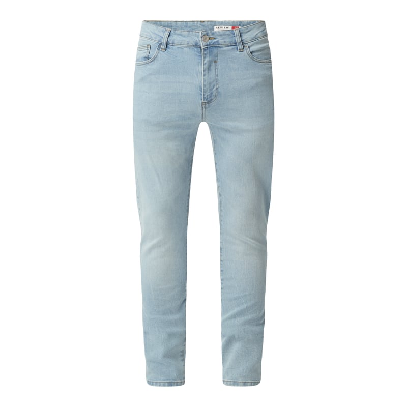Jeansy męskie REVIEW, Mieszanka bawełny i elastanu , Krój skinny fit, Zapięcie na guzik i zamek błyskawiczny , 5 kieszeni , Naszywka z logo , Długość wewnętrzna nogawki w rozmiarze 32/32: 77 cm, Szerokość w pasie w rozmiarze 32/32: 82 cm