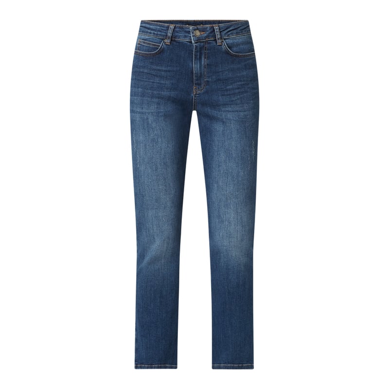 Jeansy damskie MORE & MORE, Mieszanka bawełny z dodatkiem streczu , Krój straight fit , Zapięcie na guzik i zamek błyskawiczny , 5 kieszeni , Naszywka z logo , Długość wewnętrzna nogawki w rozmiarze 36: 70 cm , Szerokość w pasie w rozmiarze 36: 74 cm