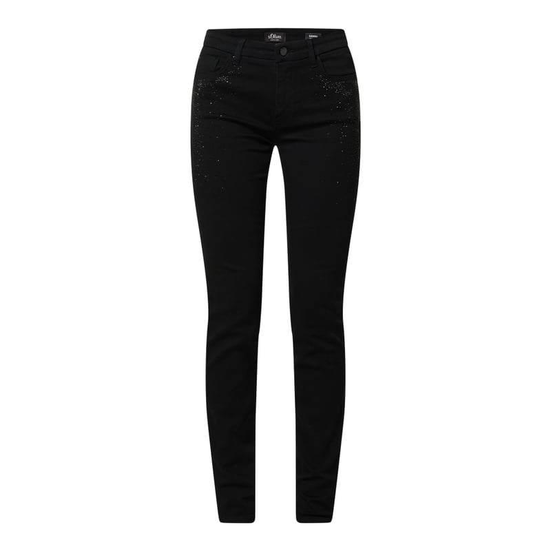 Jeansy damskie s.Oliver BLACK LABEL, Mieszanka bawełny z dodatkiem streczu , Krój skinny fit, Zapięcie na guzik i zamek błyskawiczny , Kamienie stras , Naszywka z logo , Długość wewnętrzna nogawki w rozmiarze 36/32: 82 cm, Szerokość w pasie w rozmiarze 36/32: 76 cm
