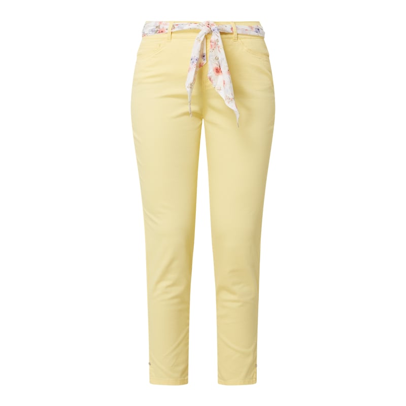 Jeansy damskie Christian Berg Women, Mieszanka bawełny i elastanu , Krój skinny fit , Zapięcie na guzik i zamek błyskawiczny , 5 kieszeni , Zakończenia nogawek z rozcięciem , Pasek do wiązania z kwiatowym wzorem , Długość wewnętrzna nogawki w rozmiarze 36/28: 70 cm , Szerokość w pasie w rozmiarze 36/28: 76 cm