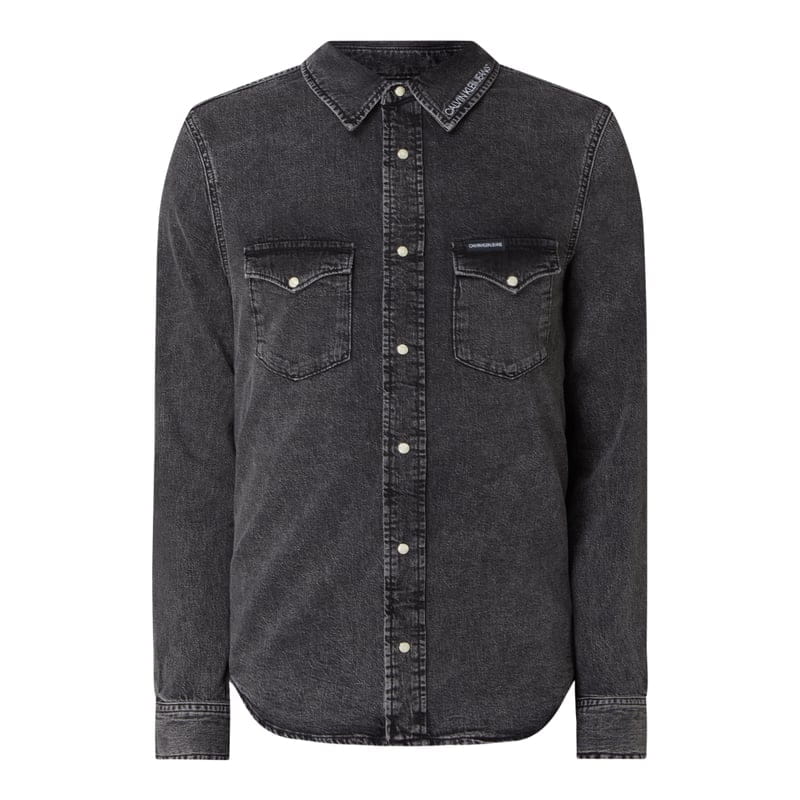Koszula jeansowa męska Calvin Klein Jeans, Czysta bawełna , Krój slim fit , Efekt sprania , Kołnierzyk typu kent , Długie rękawy , Listwa z zatrzaskami z guzikami z imitacji masy perłowej , Kieszenie na piersi , Mankiety zapinane na 1 guzik , Logo , Długość tyłu w rozmiarze M: 72 cm , Szerokość ramion w rozmiarze M: 42 cm , Długość rękawa w rozmiarze M: 67 cm