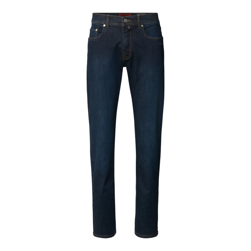 Jeansy męskie Pierre Cardin, Mieszanka bawełny z dodatkiem streczu , Krój slim fit , Zapięcie na guzik i zamek błyskawiczny , 5 kieszeni , Szwy w kontrastowym kolorze i ozdobne , Naszywka z logo