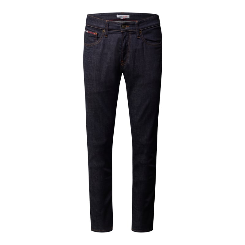 Jeansy męskie Tommy Jeans, Mieszanka bawełny i elastanu , Krój slim fit , Zapięcie na guzik i zamek błyskawiczny , 5 kieszeni , Szwy w kontrastowym kolorze i ozdobne , Długość wewnętrzna nogawki w rozmiarze 32/32: 80,5 cm , Szerokość w pasie w rozmiarze 32/32: 88 cm