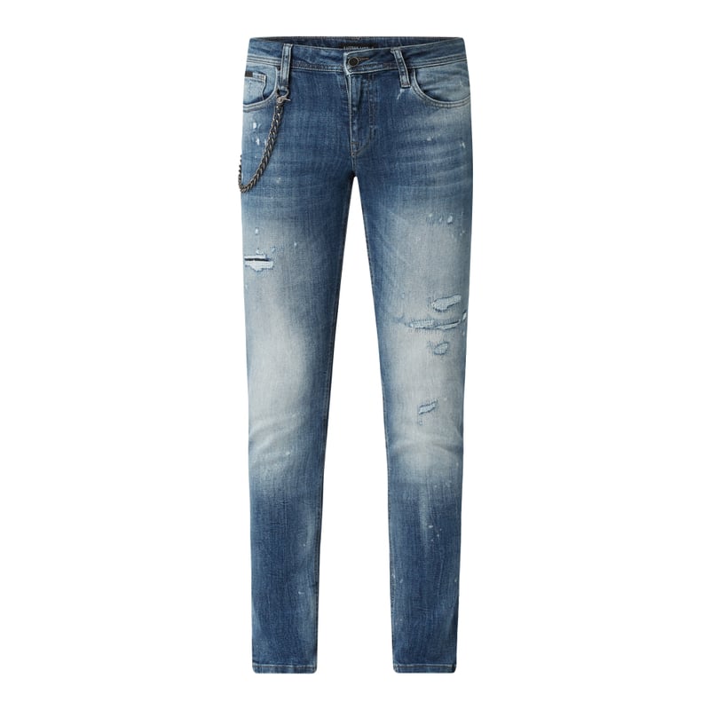 Jeansy męskie Antony Morato, Mieszanka materiałów z dodatkiem bawełny, Krój tapered fit, Zapięcie na guzik i zamek błyskawiczny , 5 kieszeni , Efekt znoszenia , Odpinany łańcuszek , Naszywka z logo , Długość wewnętrzna nogawki w rozmiarze 32: 79 cm, Szerokość w pasie w rozmiarze 32: 78 cm