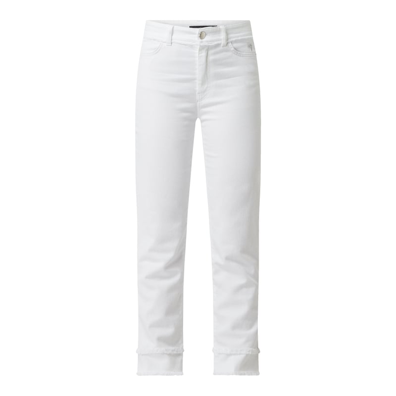 Jeansy damskie Marc Cain Additions, Mieszanka bawełny i elastanu, Krój tapered fit, Krój krótki, Wysoki stan, Zapięcie na guzik i zamek błyskawiczny, 5 kieszeni, Naszywka z logo w pasie, Zakończenia nogawek z frędzlami, Długość wewnętrzna nogawki w rozmiarze 36: 69 cm, Szerokość w pasie w rozmiarze 36: 76 cm
