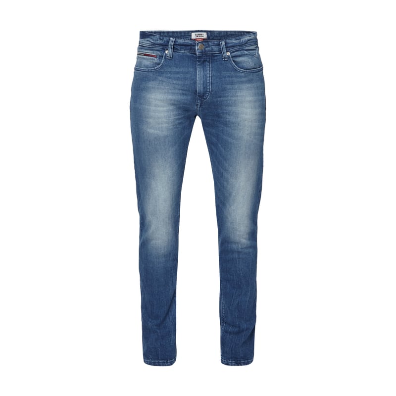 Jeansy męskie z 5 kieszeniami Tommy Jeans, Mieszanka bawełny i elastanu, Model Steve, Odcień Stone Washed , Krój slim tapered fit, Zapięcie na guzik i zamek błyskawiczny, Jedna dodatkowa kieszonka na monety, Naszywka z logo, Długość wewnętrzna nogawki w rozmiarze 32/32: 78 cm, Szerokość w pasie w rozmiarze 32/32: 86 cm