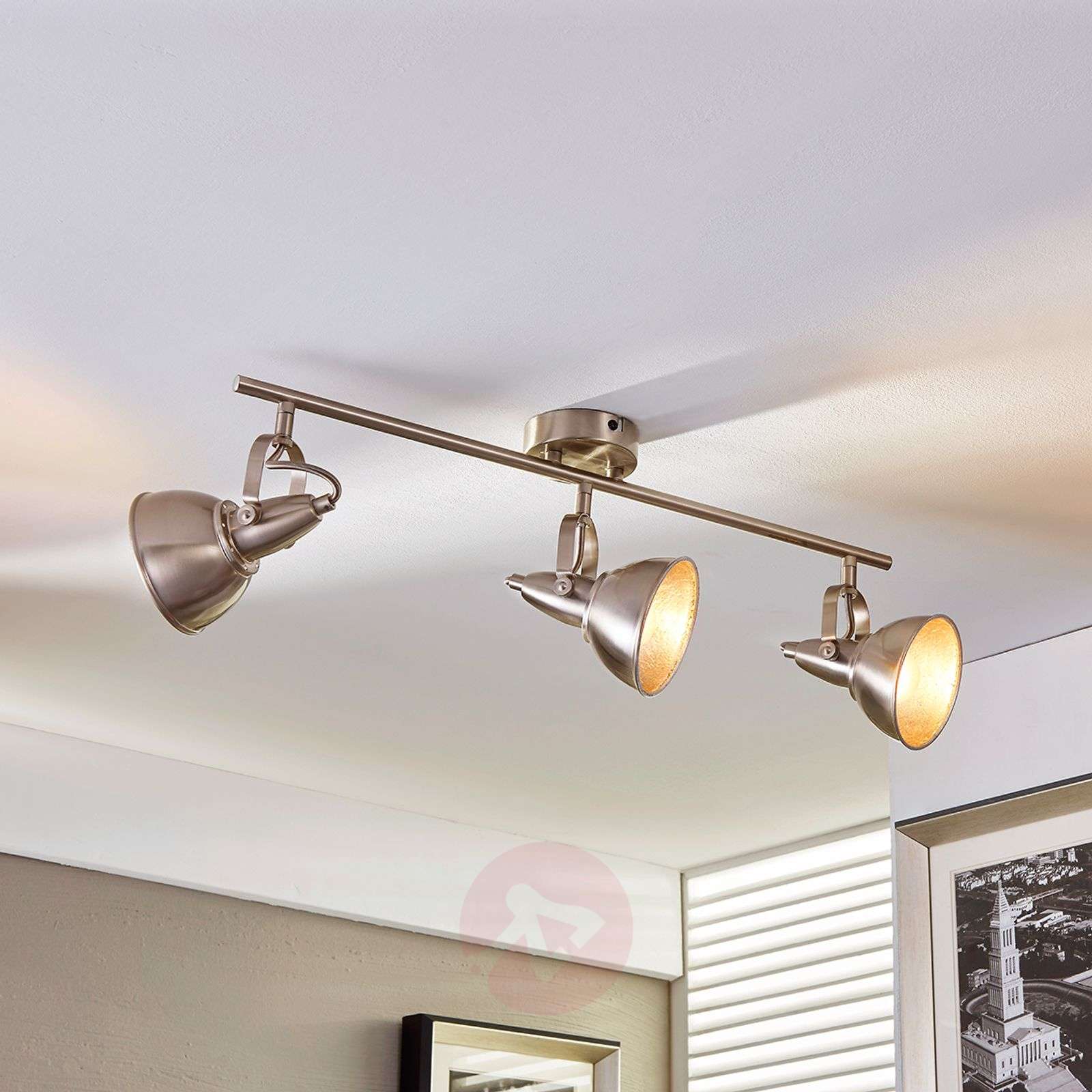 Atrakcyjna lampa sufitowa Julin ze srebrnym wnętrzem w stylu vintage Lampa Julin posiada trzy klosze, które przystosowane są do żarówek z trzonkiem E14 i zapewniają dostatecznie jasne światło podstawowe do oświetlenia pomieszczenia. Dodatkowo każdy klosz jest regulowany - można je obracać i odchylać - tak, by dostosować światło do swoich potrzeb. Powierzchnia lampy posiada matowe niklowe wykończenie, z kolei wnętrze metalowego klosza jest pokryte srebrną folią, która nadaje całości styl vintage, ponieważ srebrna farba sprawia wrażenie, jakby się łuszczyła. Lampa sufitowa Julin jest doskonałym dodatkiem zwłaszcza do kuchni utrzymanej w stylu industrialnym lub vintage. Klasa efektywności energetycznej: A++
