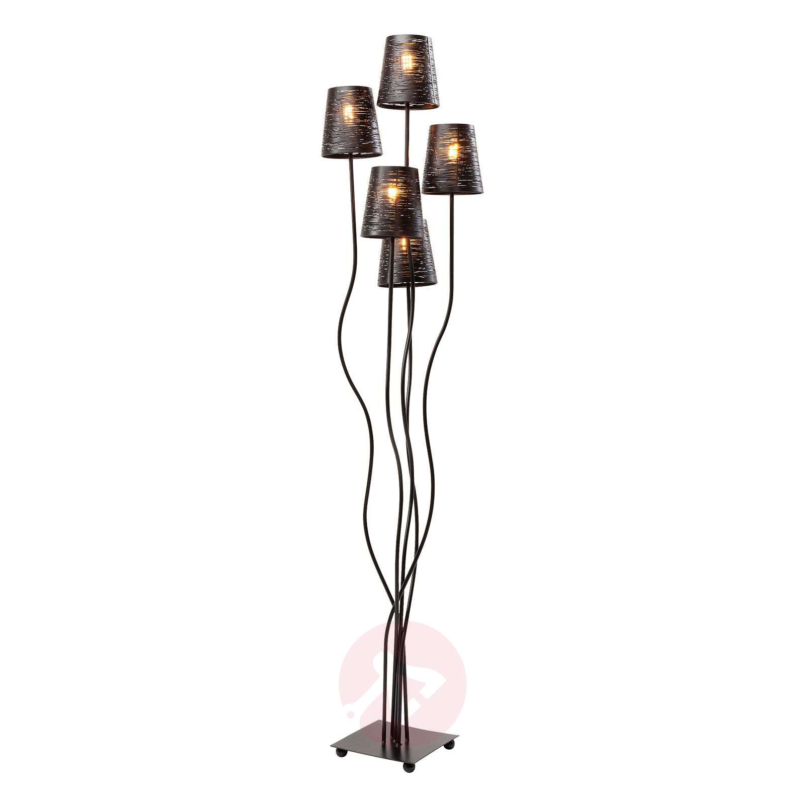 5-punktowa lampa podłogowa Flexible - cała czarna Urban-chic meets Industrial-Look - tak można by w przybliżeniu opisać 5-punktową lampę podłogową Flexible. Klosze wykonane ze stali ażurowej wznoszą się na zakrzywionych stelażach i kończą na różnych wysokościach. Wąskie szczeliny przepuszczają światło i tworzą wspaniałe efekty, podczas gdy w pomieszczeniu powstaje miękkie oświetlenie, wychodzące głównie z kloszy na górze i na dole. Światło można wygodnie włączać i wyłączać za pomocą wbudowanego w kabel włącznika nożnego. Pomimo swojej czarnej kolorystyki lampa stojąca Flexible wydaje się niezwykle żywa i można by pomyśleć, że klosze unoszą się jak balony wypełnione gazem na sznurkach w pomieszczeniu. Klasa efektywności energetycznej: A++
