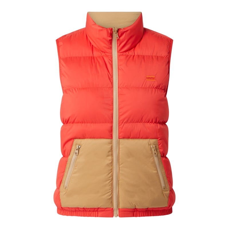 Kamizelka pikowana damska Levi's®, Wytrzymały materiał , Taliowany krój, Dwustronna, Stójka, Zamek błyskawiczny , Kieszenie zapinane na zamek błyskawiczny, Lekkie watowanie , Długość tyłu w rozmiarze S: 52 cm