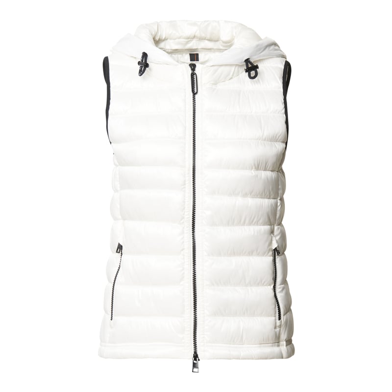 Kamizelka pikowana damska Marc Cain, Wytrzymały materiał, Prosty krój, Kaptur z tunelem, Zamek błyskawiczny dwustronny, Boczne kieszenie zapinane na zamek błyskawiczny, Długość tyłu w rozmiarze 36: 61 cm, Szerokość ramion w rozmiarze 36: 38 cm, Szerokość klatki piersiowej w rozmiarze 36: 46 cm