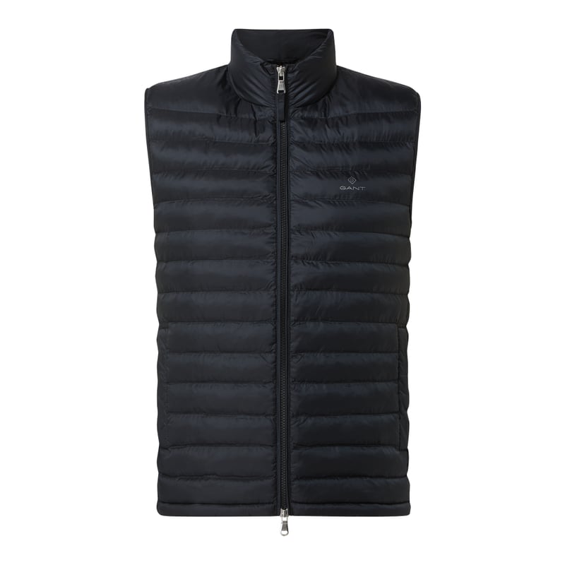 Kamizelka pikowana męska GANT, Wytrzymały materiał, Prosty krój, Stójka, Zamek błyskawiczny, Kieszenie z wypustką na zatrzask , Logo, Watowanie z poliestru z recyklingu, Długość tyłu w rozmiarze S: 65 cm