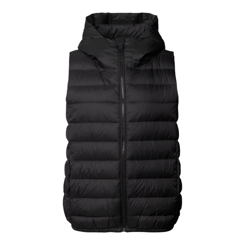 Kamizelka puchowa damska BOSS, Wytrzymały materiał, Prosty krój, Z efektem pikowania, Kaptur, Zamek błyskawiczny na całej długości, Boczne wpuszczane kieszenie, Wypełnienie puchem i pierzem, Długość tyłu w rozmiarze 36: 62 cm, Szerokość ramion w rozmiarze 36: 38 cm, Szerokość klatki piersiowej w rozmiarze 36: 39 cm