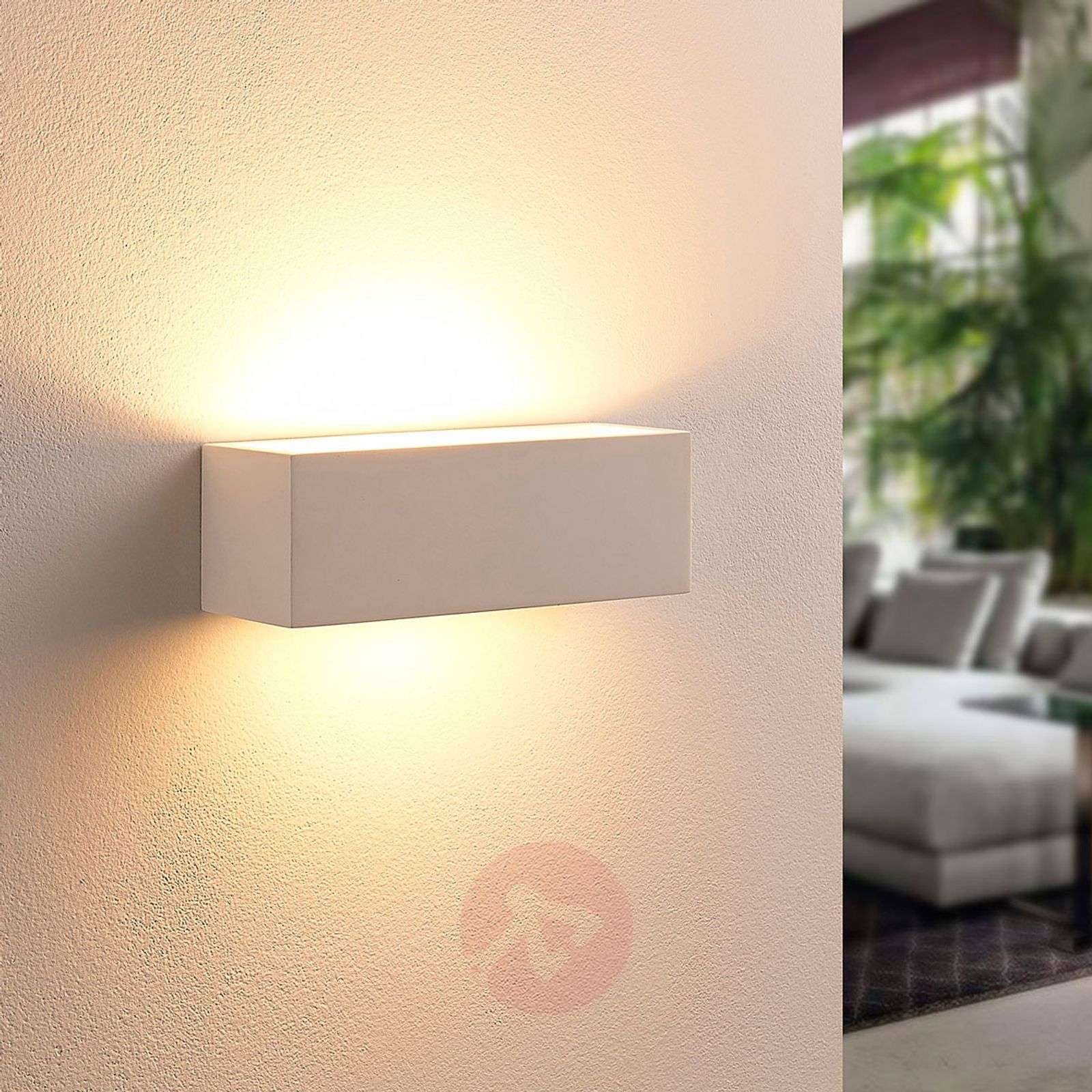 Kinkiet LED Tjada o prostoliniowym kształcie Tjada tworzy bardzo przytulne światło, które jest zawsze mile widziane w salonie. Powierzchnia gipsowej obudowy jest biała, ale w razie potrzeby można ją pomalować lub opatrzyć rysunkami, dzięki czemu będziemy mogli zrealizować jeszcze więcej własnych pomysłów. Dzięki wyposażeniu w ściemnianą żarówkę LED ta lampa ścienna Tjada należy również do energooszczędnych lamp, mogących mieć zastosowanie w salonie. Klasa efektywności energetycznej: A+