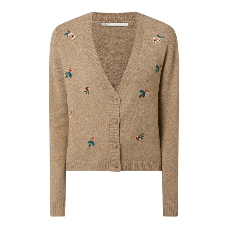 Kardigan damski ONLY , Mieszanka materiałów z poliestrem z recyklingu i dodatkiem streczu , Taliowany krój , Hafty kwiatowe , Dekolt w serek , Listwa guzikowa , Długość tyłu w rozmiarze S: 53 cm, Długość rękawa w rozmiarze S: 66 cm