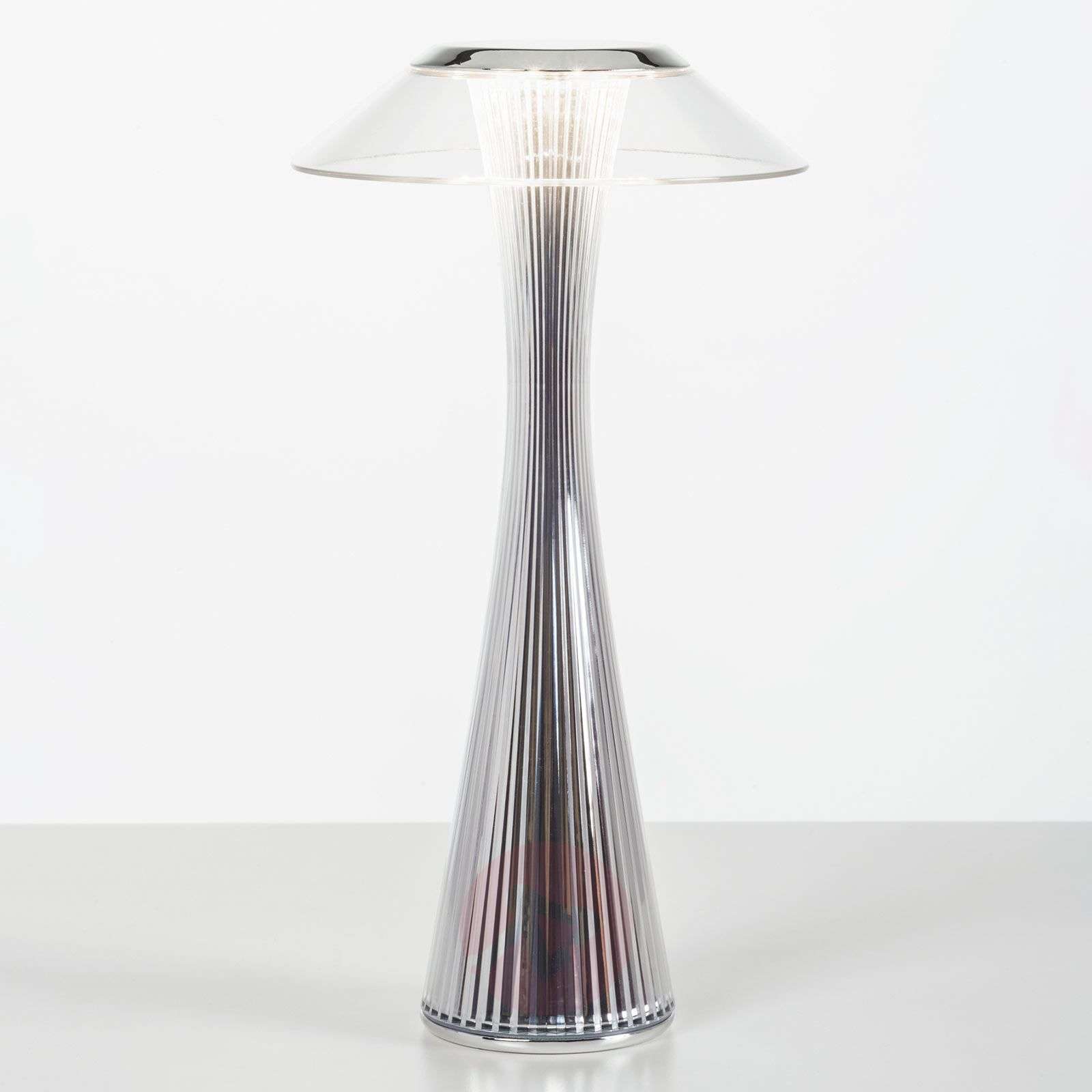 Lampa stołowa LED Space z możliwością ładowania autorstwa Adama Tihany'ego Projektant Adam Tihany podczas opracowywania lampy stołowej LED Space miał przed oczami słynną Seattle Space Needle, wieżę obserwacyjną zbudowaną na wystawę światową w 1962 roku. Bardzo futurystyczny i quasi „kosmiczny” jest więc również wygląd tej lampy stołowej. Space to lampa z akumulatorem z możliwością ładowania, która gwarantuje maksymalny czas świecenia wynoszący osiem godzin. Zarówno korpus, jak i klosz lampy wykonane zostały z różnych tworzyw sztucznych (PMMA i ABS), które są częściowo przezroczyste, a częściowo nieprzezroczyste. Space jest włączana i wyłączana poprzez dotknięcie górnej części klosza. Dla firmy designerskiej Kartell, tworzywo sztuczne we wszystkich swoich kształtach i kolorach jest jednym z najszerzej stosowanych materiałów w produktach, z których niektóre są tak znane, że stały się prawdziwą klasyką. Znane kreacje firmy Kartell to m. in. krzesełko dziecięce K 1340 i wyciskacz do cytryn KS 1481 oraz model lampy 4006 firmy Achille i Piergiacomo Castiglioni z 1959 roku. Klasa efektywności energetycznej: A+