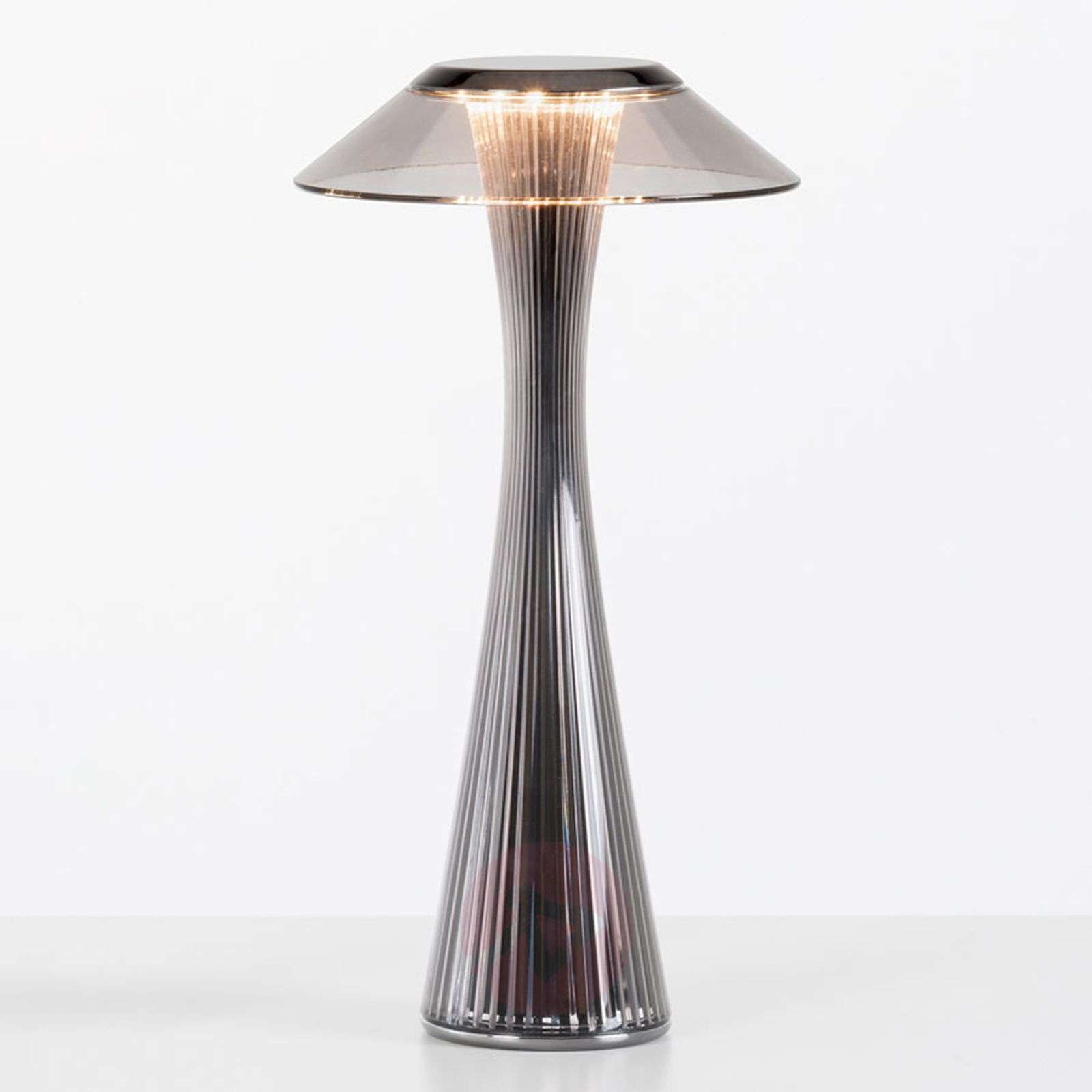 Lampa stołowa LED Space z możliwością ładowania autorstwa Adama Tihany'ego Projektant Adam Tihany podczas opracowywania lampy stołowej LED Space miał przed oczami słynną Seattle Space Needle, wieżę obserwacyjną zbudowaną na wystawę światową w 1962 roku. Bardzo futurystyczny i quasi „kosmiczny” jest więc również wygląd tej lampy stołowej. Space to lampa z akumulatorem z możliwością ładowania, która gwarantuje maksymalny czas świecenia wynoszący osiem godzin. Zarówno korpus, jak i klosz lampy wykonane zostały z różnych tworzyw sztucznych (PMMA i ABS), które są częściowo przezroczyste, a częściowo nieprzezroczyste. Space jest włączana i wyłączana poprzez dotknięcie górnej części klosza. Dla firmy designerskiej Kartell, tworzywo sztuczne we wszystkich swoich kształtach i kolorach jest jednym z najszerzej stosowanych materiałów w produktach, z których niektóre są tak znane, że stały się prawdziwą klasyką. Znane kreacje firmy Kartell to m. in. krzesełko dziecięce K 1340 i wyciskacz do cytryn KS 1481 oraz model lampy 4006 firmy Achille i Piergiacomo Castiglioni z 1959 roku. Klasa efektywności energetycznej: A+