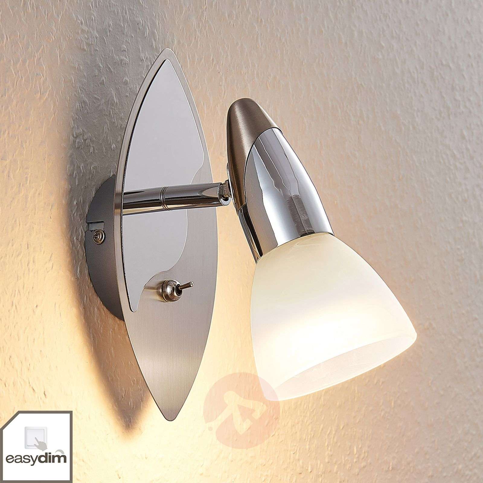 Kinkiet LED Cora z funkcją easydim 1-punktowy kinkiet LED Cora nie tylko wygląda naprawdę nowocześnie i elegancko, ale również wyróżnia się funkcją ściemniania wykorzystującą żarówki easydim. Aby uzyskać nowoczesny design, mocowanie ścienne wykonano z elementów niklowanych oraz ozdobiono chromowaną płytką dekoracyjną. Także oprawa na żarówkę jest niklowana i chromowana, przez co odzwierciedla design mocowania ściennego. Sam klosz wykonany jest z doskonałej jakości szkła o alabastrowym wyglądzie w kształcie kielicha. Sprawia on wrażenie, jakby był wykonany z przydymionego szkła i wygląda niezwykle szlachetnie. Lampa ścienna Cora może być używana na wiele sposobów, czy to w sypialni jako lampka do czytania, czy w salonie jako stylowy element wyposażenia zapewniający dyskretne oświetlenie. Reflektor LED E14 z funkcją easydim jest dołączony do kompletu. Technologia easydim może być obsługiwana za pomocą przełącznika, a proces bezstopniowego ściemniania rozpoczyna się po szybkim wyłączeniu i ponownym włączeniu lampy. Ściemnianie kończy się na jasności 10 procent lub wcześniej, jeśli proces przełączania jest powtarzany przy żądanej jasności. Klasa efektywności energetycznej: A++