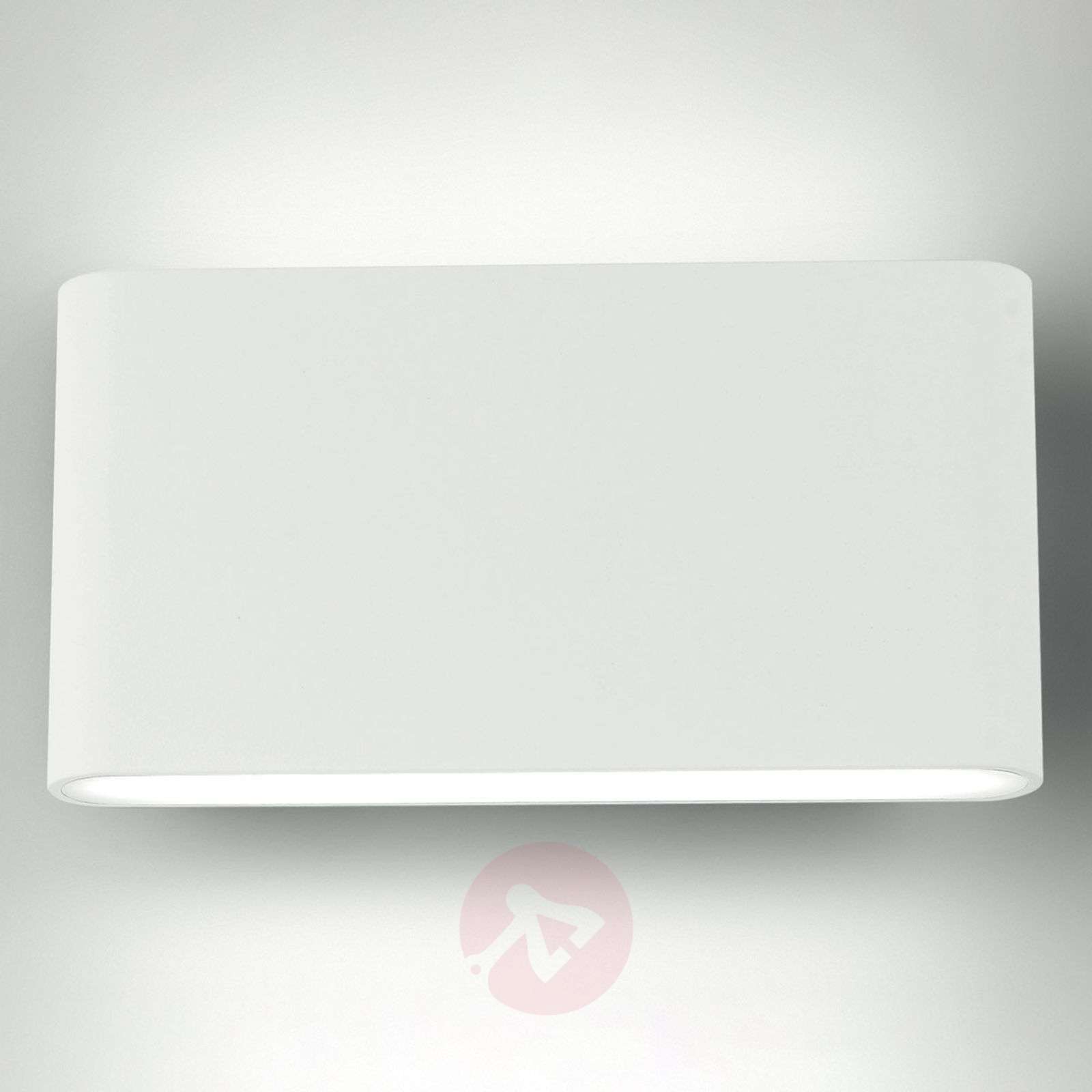Stabilny kinkiet LED Gamma do zastosowań wewnętrznych i zewnętrznych Stopień ochrony IP54 sprawia, że kinkiet LED Gamma jest w takim samym stopniu przystosowany do obszarów wewnętrznych i zewnętrznych. Biała aluminiowa obudowa chroni lampę niezawodnie i jednocześnie dobrze wygląda. Dwie diody LED we wnętrzu mają kąt wiązki 120° skierowany w górę i w dół. Powstają dwa szerokie stożki światła, które odbijają się od ściany i wytwarzają przytulne, pośrednie światło. Płaska konstrukcja i wytrzymałe materiały są bezkonkurencyjną kombinacją. Klasa efektywności energetycznej: A+