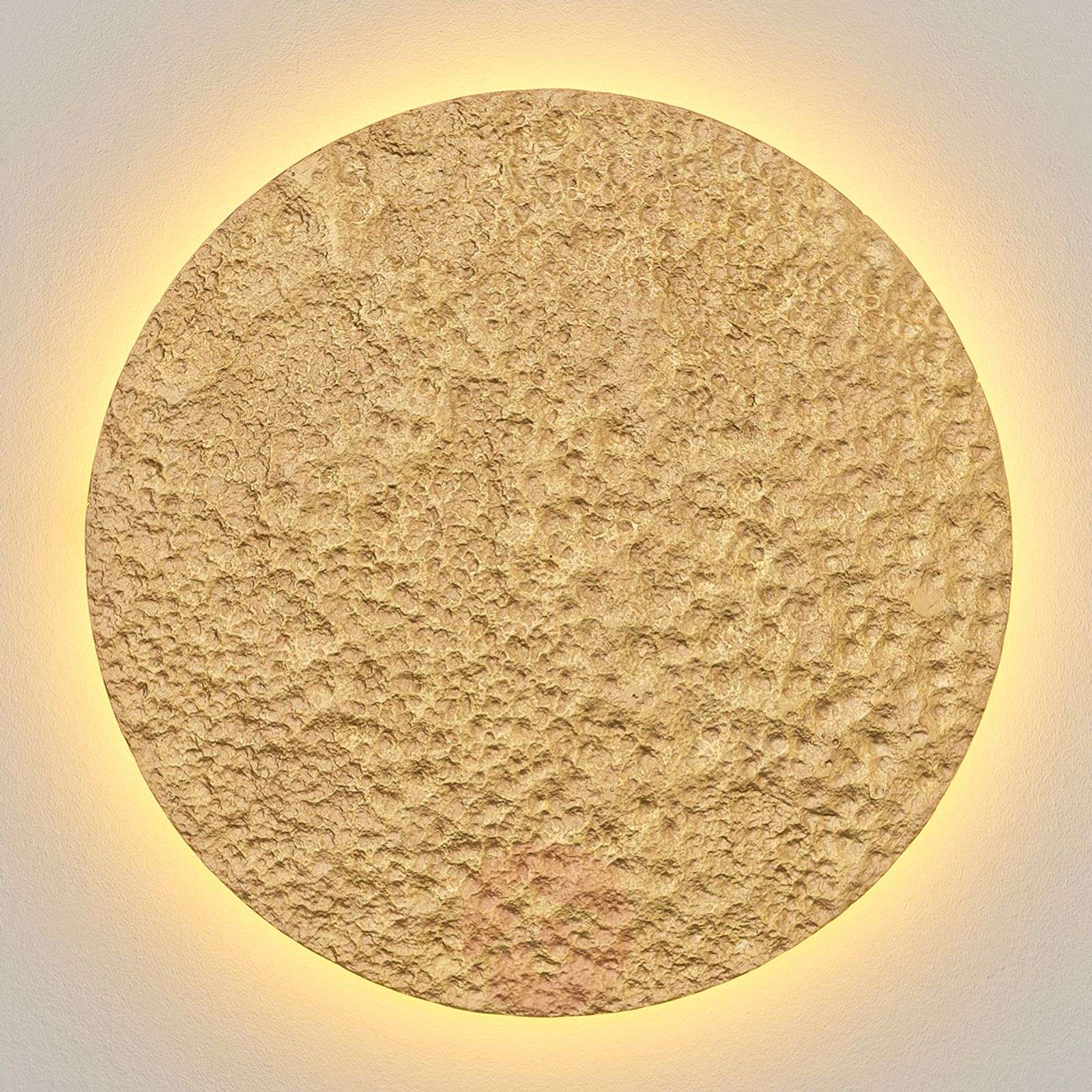 Meteor – złoty kinkiet LED o średnicy 55 cm Podobnie jak planety, kinkiet LED Meteor z żelaza ma okrągły kształt i powierzchnię o nieregularnej strukturze, która rzeczywiście przypomina krajobraz księżycowy. Na obrzeżu, z tyłu płyty, wbudowano diody LED o barwie ciepłej bieli, które tworzą na ścianie okrągłą poświatę i zapewniają przytulne oświetlenie pomieszczenia. Kinkiet LED Meteor nie tylko zapewnia przytulne oświetlenie, stanowi również atrakcyjną ozdobę ścienną. Każda pojedyncza lampa ma inną strukturę powierzchni, dlatego każdy egzemplarz to unikat. Klasa efektywności energetycznej: A+