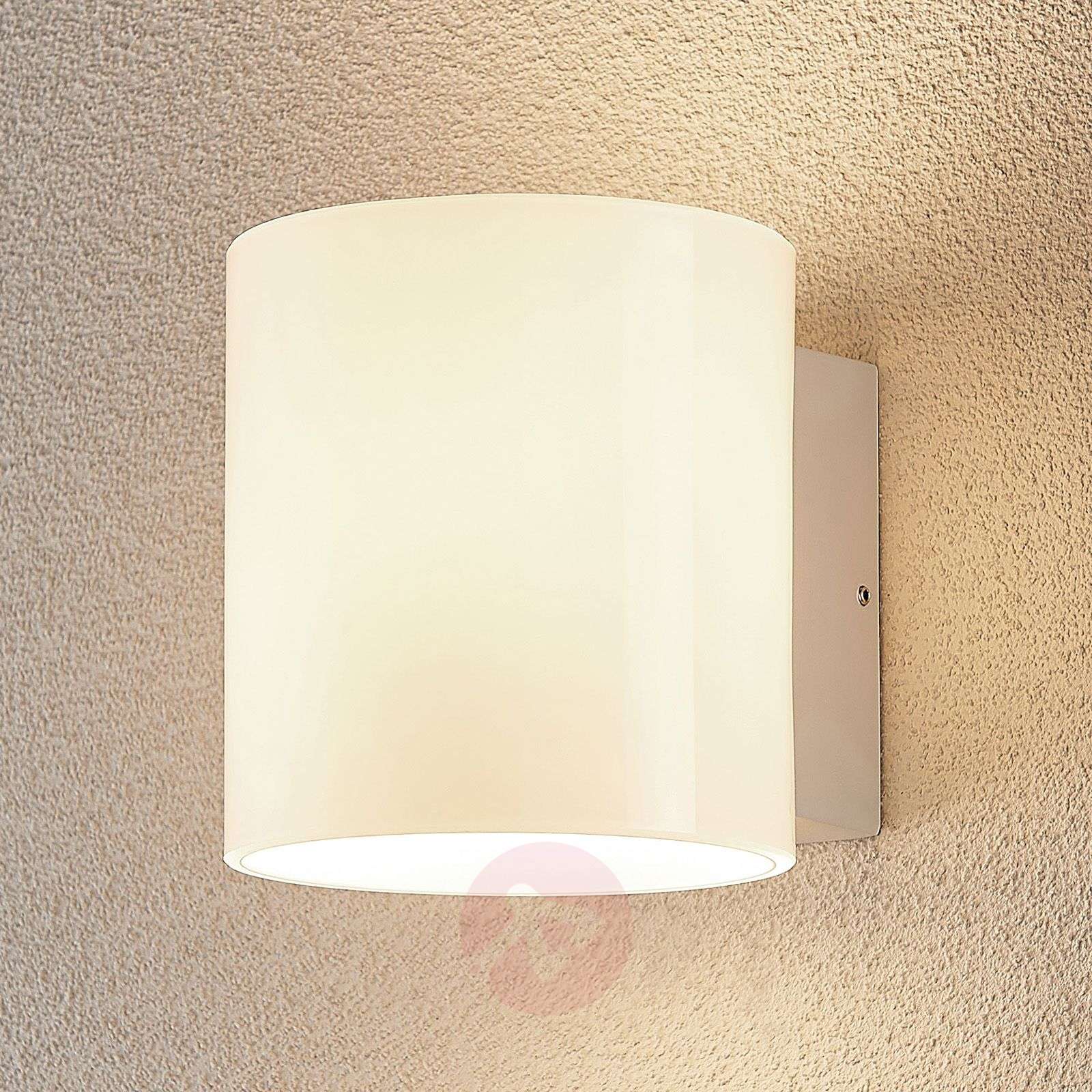Biały kinkiet zewnętrzny LED Baldur ze szklanym kloszem, o cylindrycznym kształcie Kinkiet zewnętrzny LED Baldur zachwyca swym bardzo atrakcyjnym wyglądem, charakterystycznym dla lamp używanych wewnątrz pomieszczeń. Klosz ma kształt okrągłego cylindra, a żarówka jest w nim dobrze zabezpieczona, co także potwierdza oznaczenie stopnia ochrony IP54. Dlatego też ta lampa ścienna może być bez problemu używana na zewnątrz budynków. Tu Baldur stanie się elementem przyciągającym wzrok swym harmonijnym wyglądem, gdy tylko zostanie zamontowana na elewacji. Diody LED emitują tu światło o temperaturze barwowej ciepłej bieli, a ponadto cechują się dużą energooszczędnością. Klasa efektywności energetycznej: A+
