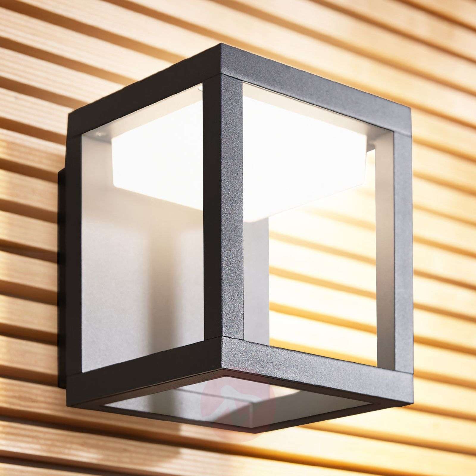 Kanciasta lampa zewnętrzna ścienna LED Gero, ciemnoszara Ta lampa zewnętrzna ścienna LED Gero po zamontowaniu na tarasie lub w ogrodzie staje się prawdziwym elementem przyciągającym wzrok. Wykonano ją z aluminiowego odlewu ciśnieniowego i opatrzono osłoną z poliwęglanu. Ta lampa w kształcie prostopadłościanu jest wytrzymała i emituje światło do otoczenia, oświetlając dużą powierzchnię. Dzięki uznanemu stopniowi ochrony IP54 Gero jest chroniona przed wnikaniem pyłu i pryskającej wody. Tym samym więc lampa ta kwalifikuje się do użytku na zewnątrz budynków i tam może być stosowana w sposób uniwersalny. Kinkiet zewnętrzny Gero nadaje współczesne akcenty wystrojowi przestrzeni i zapewnia idealne proporcje oświetlenia na zewnątrz budynków, czy to w ogrodzie, czy na tarasie, czy jako element oświetlający wejście do domu. Klasa efektywności energetycznej: A+