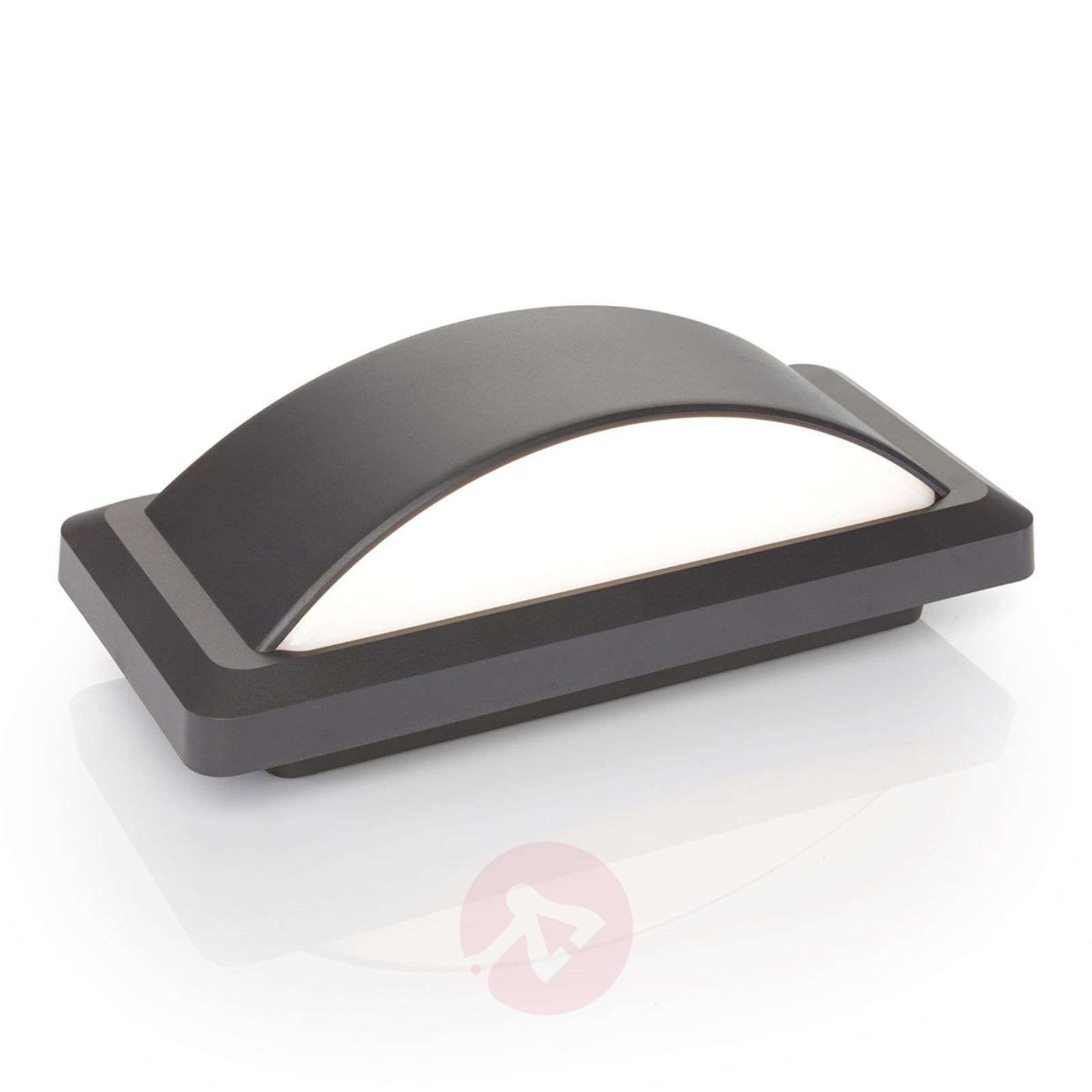 Ciemnoszara zewnętrzna lampa ścienna LED Iskia z zakrzywionym korpusem i bezpośrednio-pośrednią emisją, IP65, odporna na działanie wody morskiej Iskia dobrze komponuje się z nowoczesnymi budynkami i inną współczesną architekturą. Korpusu ma kształt kątowy, ale sama oprawa jest wygięta w kierunku przodu. W wyglądzie dominuje podstawa w kolorze ciemnoszarym (RAL 7024), natomiast biała wkładka dyfuzora widoczna jest tylko od góry lub od dołu i umożliwia łagodny rozkład światła, zarówno przy emisji bezpośredniej, jak i pośredniej. Cała obudowa wykonana jest z tworzywa sztucznego, charakteryzuje się wytrzymałością i odpornością na działanie wody morskiej, dzięki czemu lampę można użytkować przez długi czas, także w środowisku ze słonym, morskim powietrzem. Klasa efektywności energetycznej: A+