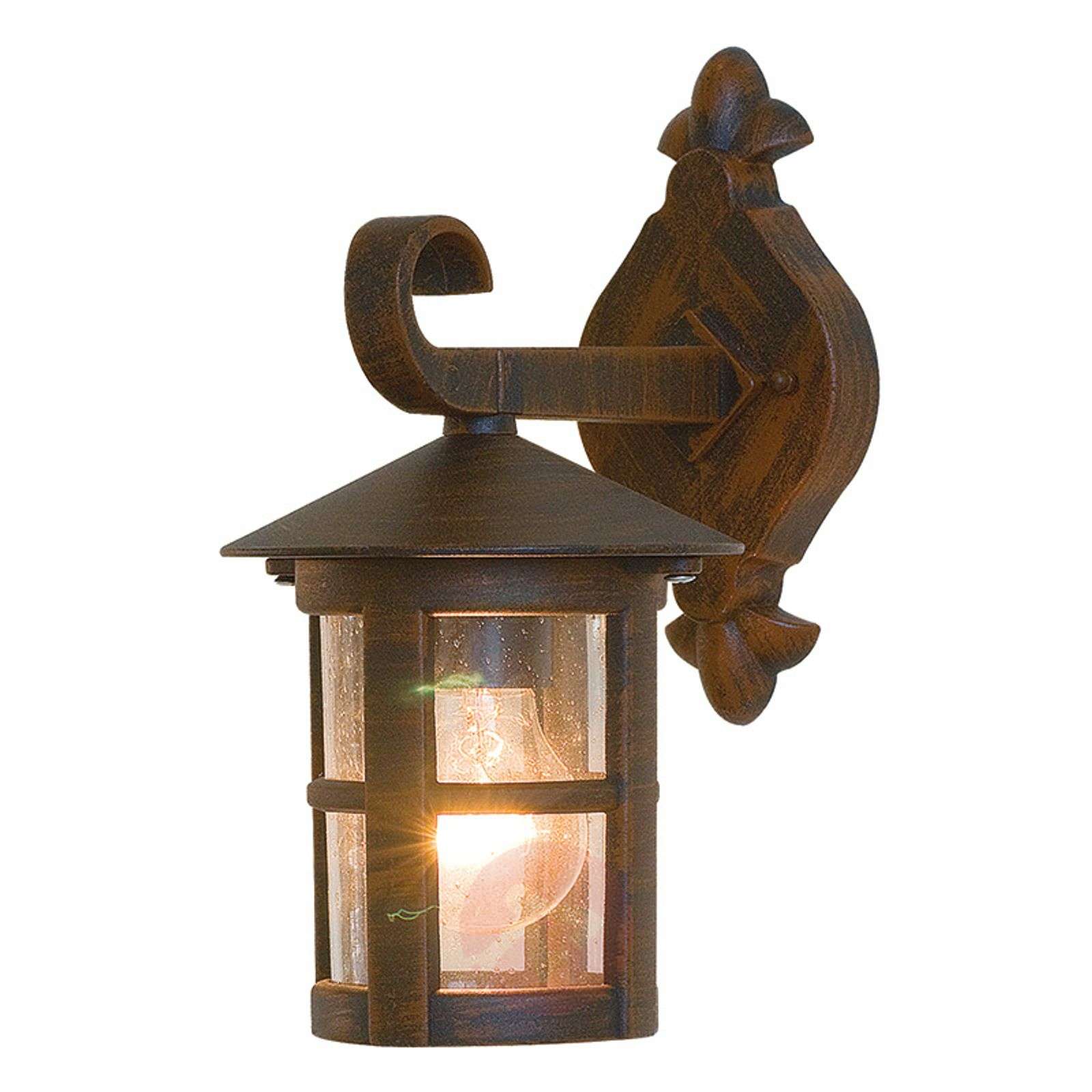 Rustykalna lampa zewnętrzna Skiathos z brązową patyną Lampa zewnętrzna Skiathos jest jak latarnia z pięknie zdobionym uchwytem ściennym i szklanymi elementami w cylindrycznym kloszu. Szkło z drobnymi wtrąceniami powietrza sprawia, że zastosowana żarówka jest widoczna. Skiathos ma raczej rustykalne wzornictwo i dzięki brązowej patynie doskonale komponuje się z naturalnym otoczeniem zewnętrznym. Ze względu na stopień ochrony IP54 nadaje się do oświetlania dróg dojazdowych i stref wejściowych. Klasa efektywności energetycznej: A++